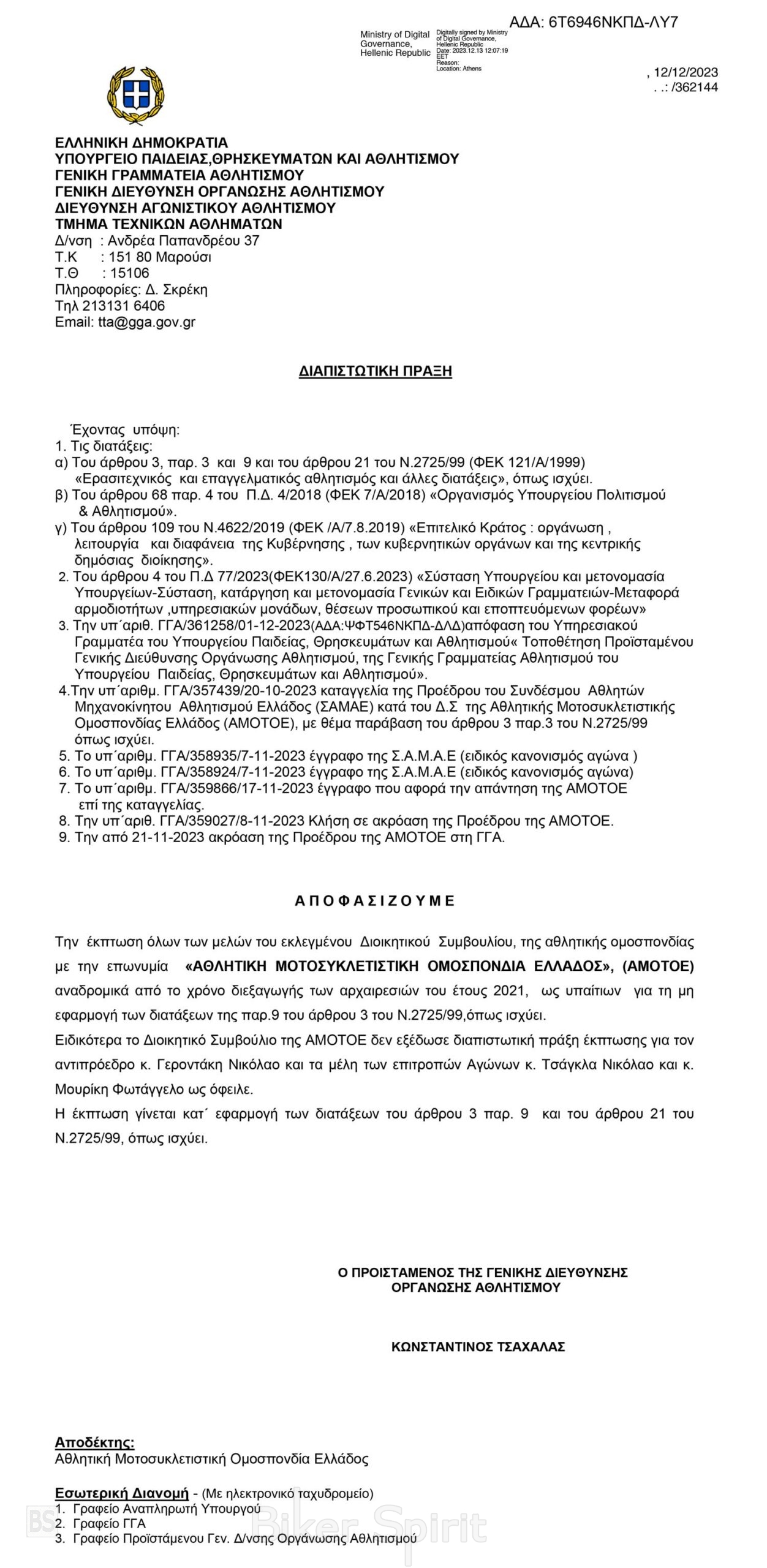 Έκπτωτο το Δ.Σ. της ΑΜΟΤΟΕ «ΑΘΛΗΤΙΚΗ ΜΟΤΟΣΥΚΛΕΤΙΣΤΙΚΗ ΟΜΟΣΠΟΝΔΙΑ ΕΛΛΑΔΟΣ» από την Γ. Γ. Αθλητισμού