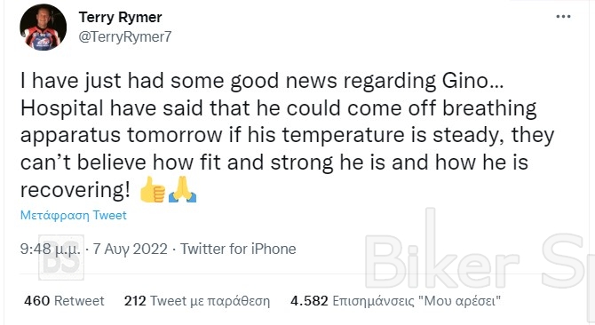 Αναλυτικά το tweet του Terry Rymer γράφει: «Μόλις είχα κάποια καλά νέα σχετικά με τον Gino… Το νοσοκομείο είπε ότι θα μπορούσε να βγει από την αναπνευστική συσκευή αύριο αν η κατάσταση του παραμείνει σταθερή, δεν μπορούν να πιστέψουν πόσο σε φόρμα και πόσο δυνατός είναι και πώς αναρρώνει!»