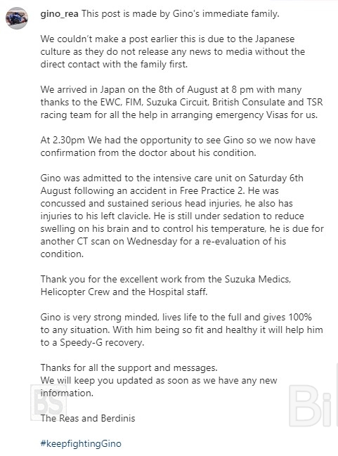 Η οικογένεια του Gino Rea με μια ανάρτηση της στο Instagram ενημερώνει για την κατάσταση της υγείας του μετα το ατύχημα στον 8ωρο της Suzuka