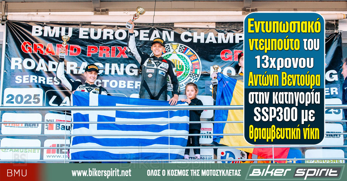 Ο 13χρονος Αντώνης Βεντούρας συνεχίζει να εντυπωσιάζει το πανελλήνιο και βαλκανικό κοινό των αγώνων ταχύτητας, πετυχαίνοντας μια εντυπωσιακή νίκη στο ντεμπούτο του στην κατηγορία SSP300 με την Yamaha R3.