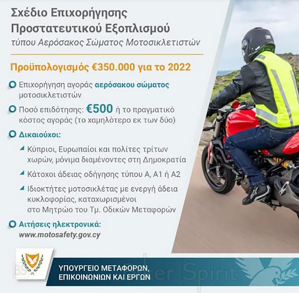 Επιδότηση προστατευτικού εξοπλισμού τύπου αερόσακος σώματος, κράνους, γάντια ή άλλου εξοπλισμού για μοτοσικλετιστές, στην Κύπρο!