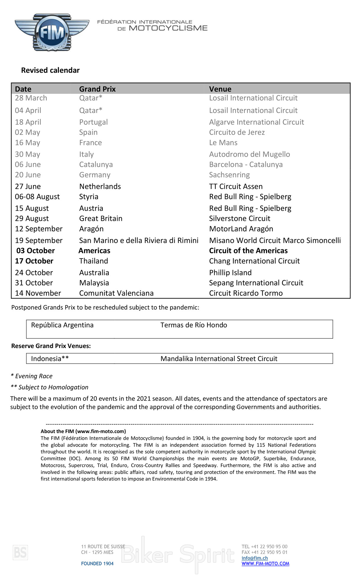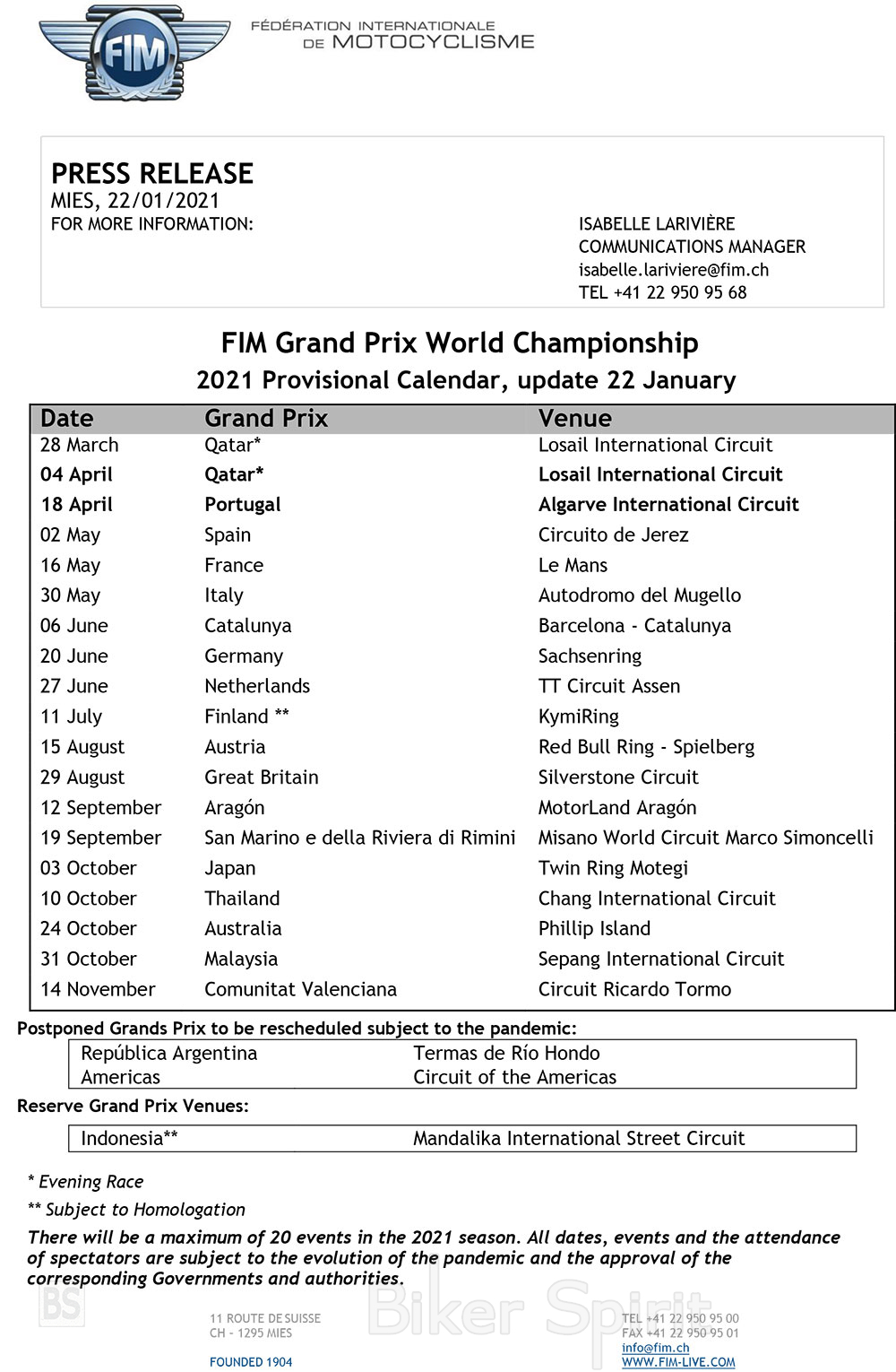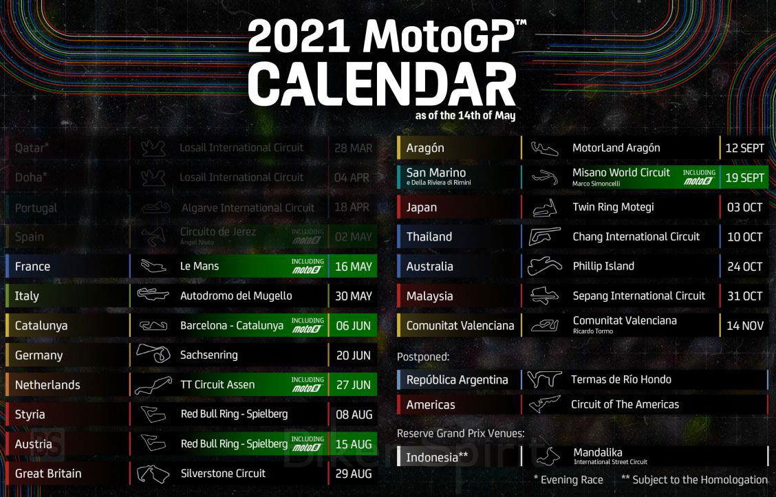 Η συνεχιζόμενη πανδημία Covid-19 και οι επακόλουθες επιπλοκές λόγο καραντίνας, υποχρεώνουν δυστυχώς την αναβολή τόσο του GP της Αργεντινής όσο και του GP της Αμερικής έως το τελευταίο τρίμηνο του 2021, με το Mandalika International Street Circuit στην Ινδονησία να τοποθετείται ως εφεδρικό Grand Prix, υπό επιφύλαξη.