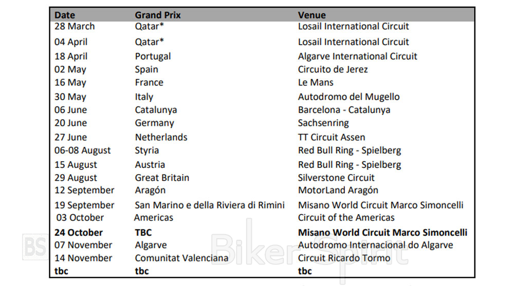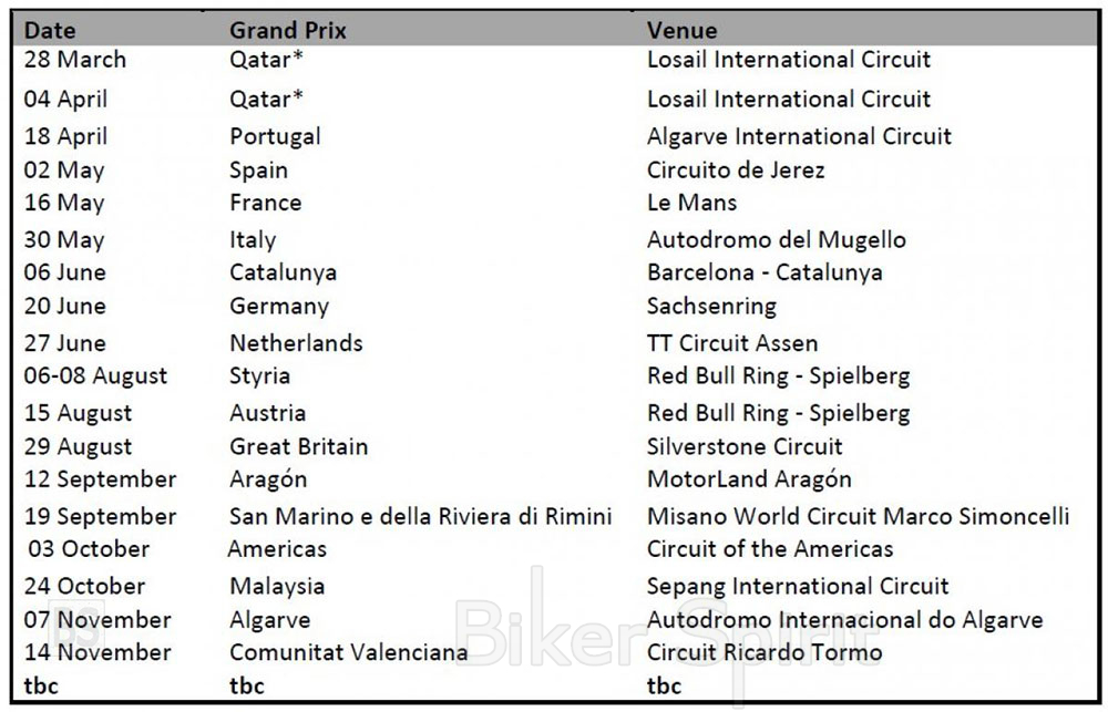 Το άνοιγμα της σεζόν Grand Prix στο Κατάρ παραμένει επιβεβαιωμένο για τις 26 έως τις 28 Μαρτίου και τώρα θα ακολουθήσει ένα δεύτερο αγώνας, στην ίδια πίστα, Losail International Circuit το επόμενο Σαββατοκύριακο, από το 2 έως το 4 Απριλίου.