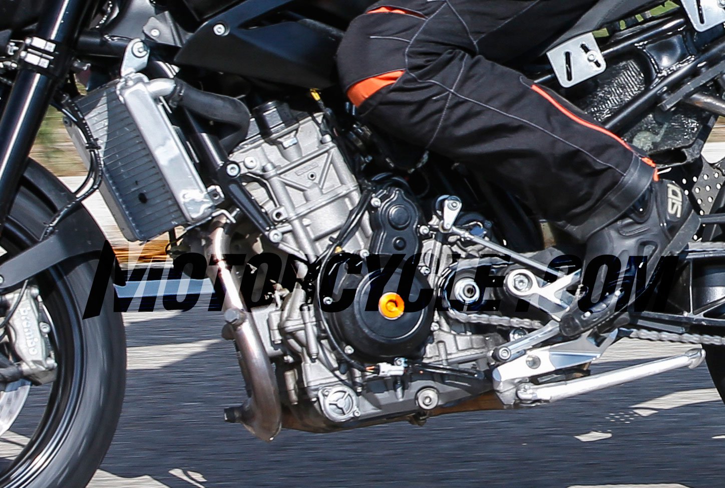 Με μια πρώτη ματιά, προσπερνώντας τα περιφερικά που είναι πάντα τα καλύτερα στις μοτοσυκλέτες ΚΤΜ, έναν δικύλινδρο εν σειρά υδρόψυκτο κινητήρα, που ενδεχομένως να αποτελεί και κομμάτι του πλαισίου αφού το γνωστό σωληνωτό χωροδικτύωμα φαίνεται ελάχιστα, (ίσως να κρύβεται από τα πόδια του αναβάτη).