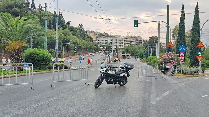 Πάνω από 25 μοτοσικλέτες της ομάδας «V-STROM Greek Riders», σε συνεργασία με την ΕΛ.ΑΣ, την Δημοτική Αστυνομία, το ΕΚΑΒ και άλλους φορείς, βοήθησαν στο να διασφαλιστεί η ομαλή διέλευση των δρομέων, που έγινε υπό καταρρακτώδη βροχή.