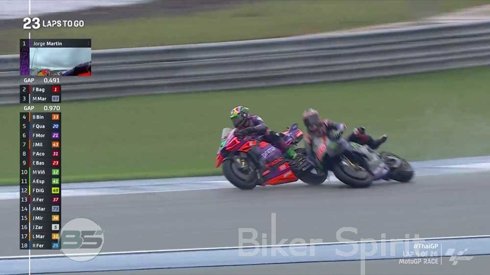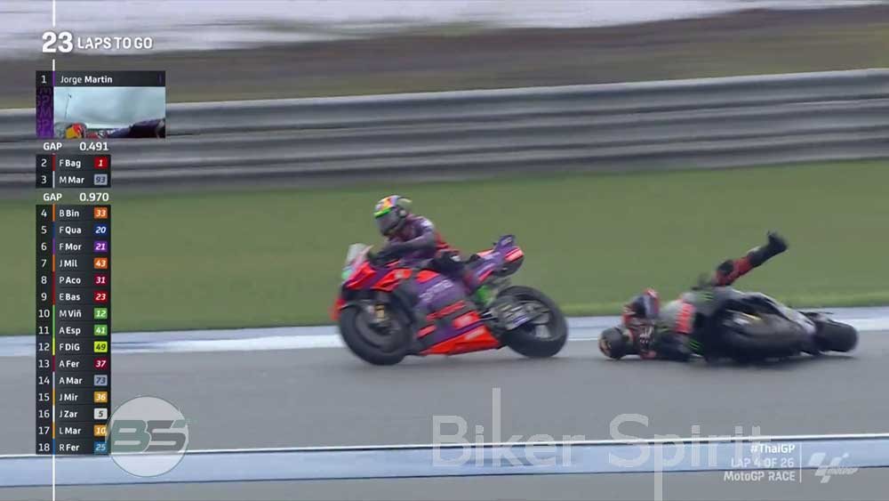 Αν το Σάββατο ο αγώνας του σπριντ του διακυβεύτηκε από ένα χτύπημα του Brad Binder, η Κυριακή του επιφύλασσε κάτι χειρότερο: ο Franco Morbidelli τον χτύπησε και τον πέταξε όταν ήταν στις μπροστινές θέσεις, εκμεταλλευόμενος τις βρεγμένες συνθήκες στο Chang International..