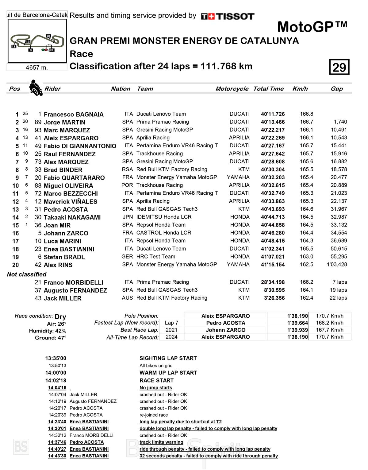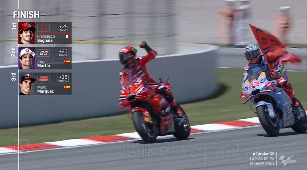 Νικητής του αγώνα ο εκπληκτικός Pecco Bagnaia που έκανε ένα πολύ ψύχραιμο αγώνα και με πολύ καλό σχεδιασμό δεν άφησε τίποτα στην τύχη και παρόλο που έχασε μερικές μάχες, είχε τελικά απαντήσεις για όλους και κατάφερε να περάσει την γραμμή τερματισμού πρώτος, παίρνοντας την καρό σημαία για πρώτη φορά στην πίστα της Catalunya, την τρίτη της σεζόν, την 21η στο MotoGP και την 31η στην καριέρα του!