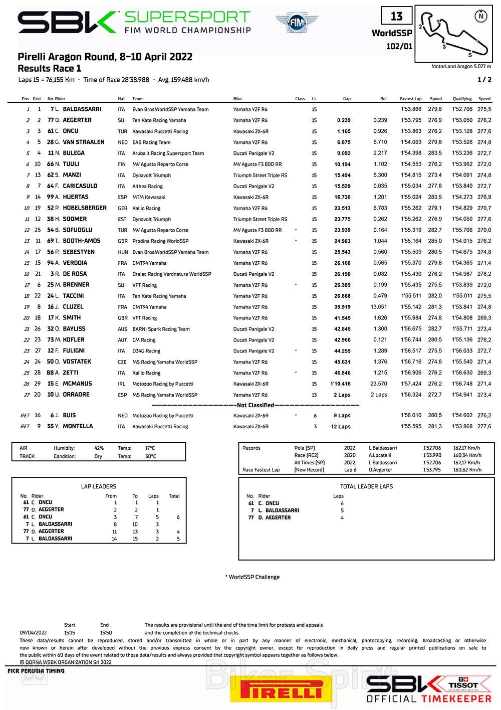 Η δεύτερη θέση για τον Aegerter ήταν το 17ο βάθρο του στο WorldSSP καθώς ο Πρωταθλητής ξεκίνησε τη σεζόν με ένα βάθρο, ενώ ο Oncu κατέκτησε το τέταρτο βάθρο του στο WorldSSP.