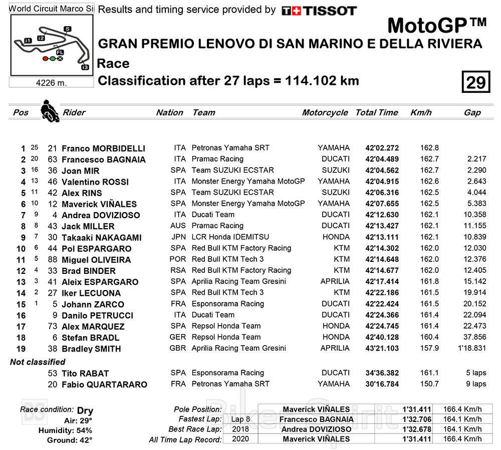 Στην 7η θέση τερμάτισε Andrea Dovizioso, όπου χάρη στην απροσδόκητη πτώση του Fabio Quartararo (που έπεσε χωρίς συνέπειες), παίρνει το προβάδισμα στο παγκόσμιο πρωτάθλημα με 6 βαθμούς διαφορά πλέον!