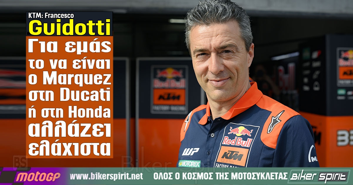 Παρ’ όλα αυτά, ο Guidotti δεν ανησυχεί. «Για εμάς, το να έχουμε τον Márquez στη Ducati ή τη Honda αλλάζει ελάχιστα. Για εμάς, ο Marc ήταν πάντα ο αντίπαλος που έπρεπε να νικήσουμε με μια ανταγωνιστική Honda όπως την ξέραμε όλοι. Η KTM δεν είναι τυφλή, επικεντρώνεται στη βελτίωση εσωτερικά για να είναι προετοιμασμένη. Για το θέμα της Ducati, δεν έχω τίποτα εναντίον τους και δεν θέλω να τροφοδοτήσω την κριτική. Γεγονός είναι ότι η Ducati έχει ένα μεγάλο πλεονέκτημα αυτή τη στιγμή. Με 8 μοτοσυκλέτες στην πίστα, έχουν πολλά δεδομένα για σύγκριση. Νομίζω ότι ήταν καλοί στο να οργανωθούν για να διαχειριστούν τόσες πολλές μοτοσυκλέτες και να τις κάνουν ελκυστικές.»