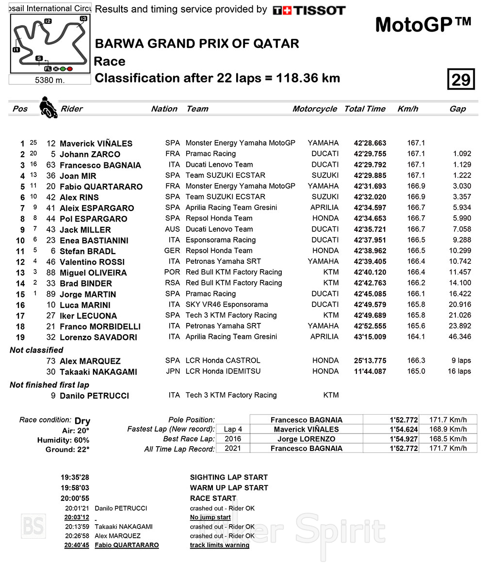 Αποδείχθηκε ένας δύσκολος και απογοητευτικός εναρκτήριος γύρος για την PETRONAS Yamaha Sepang Racing Team, με τους Valentino Rossi και Franco Morbidelli, οι οποίοι αντιμετώπισαν μηχανικά ζητήματα, τερματίζοντας το Grand Prix του Κατάρ 12η και 18η αντίστοιχα.