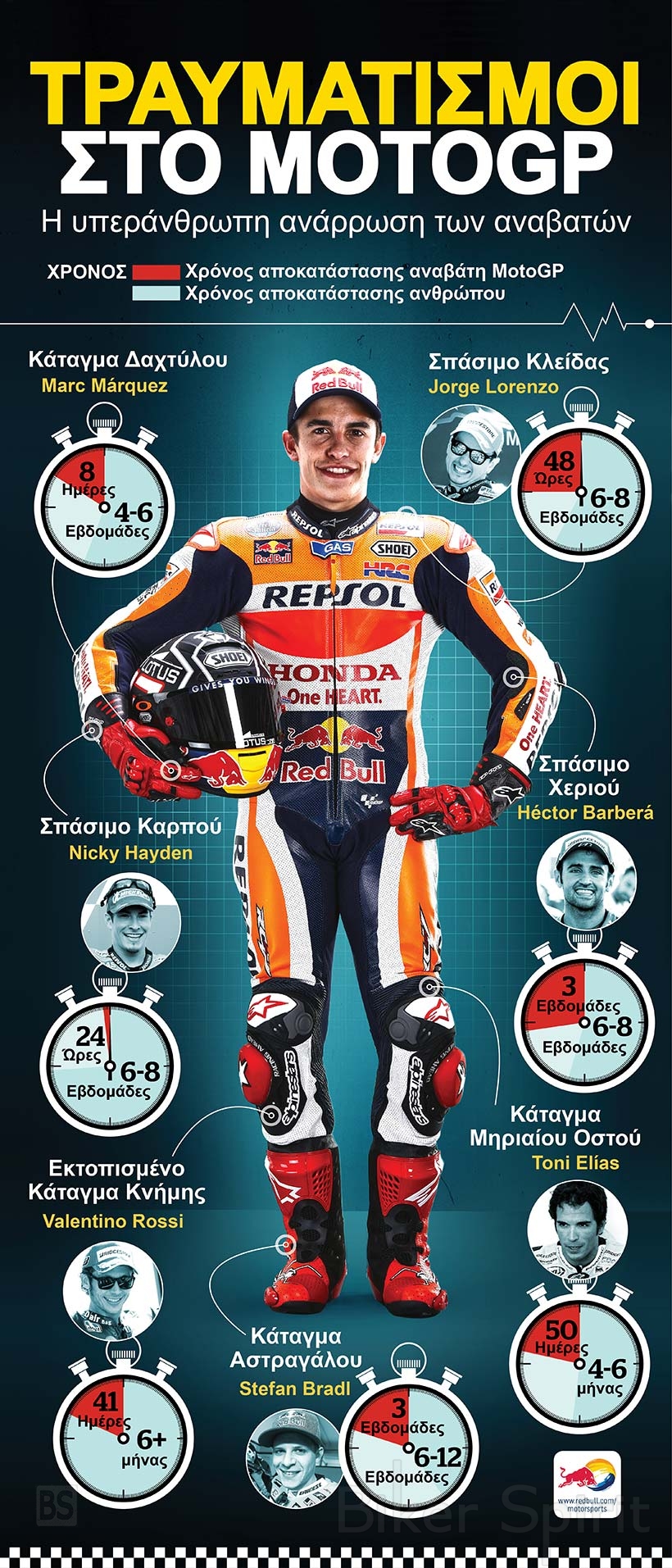 Το RedBull.com έφτιαξε πρόσφατα αυτό το infographic που δείχνει τους απίστευτους χρόνους αποθεραπείας που χρειάστηκαν οι οδηγοί του MotoGP για να επιστρέψουν πάνω στη μοτοσυκλέτα.