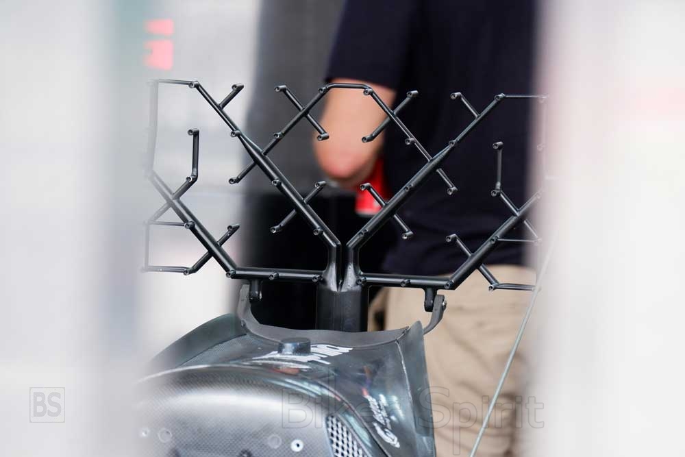 Αυτές οι αεροδυναμικές σχάρες χρησιμοποιούνται για να βοηθήσουν στην κατανόηση της ροής αέρα σε μια συγκεκριμένη διατομή. Η Aprilia φαίνεται να έχει επικεντρωθεί σε μεγάλο βαθμό στον περιορισμό της αντίστασης διατηρώντας την κάθετη δύναμη της φέτος, δεν αποτελεί έκπληξη να τη βλέπουμε να παρακολουθεί το πίσω μέρος του αναβάτη, που ήταν ένα από τα προβλήματα της κατά καιρούς