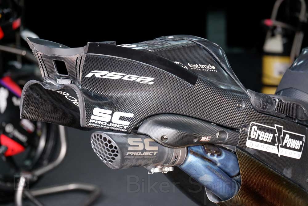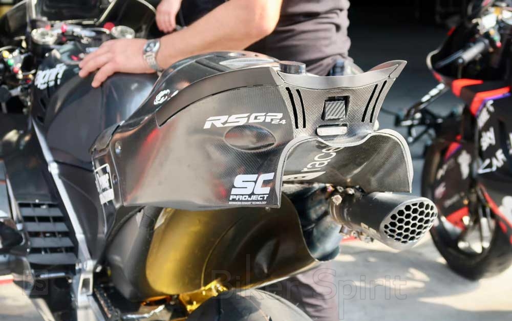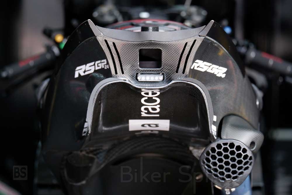 Η Aprilia μας έδειξε επίσης μια νέα ουρά που είναι πολύ ενδιαφέρον. Έχει ένα σχήμα για να δημιουργήσει αναμφίβολα κάποια πίεση προς τα κάτω, αλλά στη συνέχεια από κάτω έχει ουσιαστικά αυτό που μοιάζει πολύ παρόμοιο σχήμα με έναν διαχύτη που έχουμε δει στην F1.