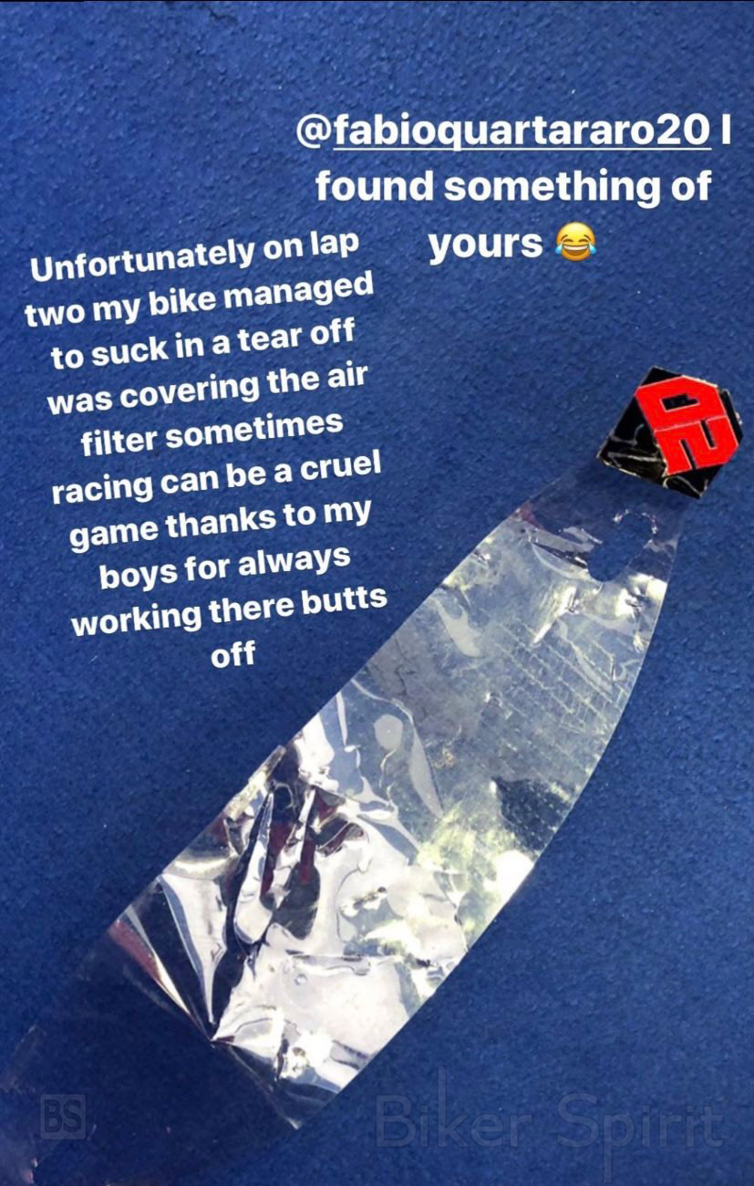 Πίσω στο γκαράζ πίστευε ότι το πρόβλημα σχετίζεται με τον πίσω τροχό, αλλά στο τέλος του αγώνα ο μηχανικός του αποσυναρμολόγησε τη μοτοσυκλέτα και βρήκε την ανεπιθύμητη έκπληξη: Μία αφαιρούμενη ζελατίνα του Fabio Quartararo είχε μπλοκάρει το φίλτρο αέρα.