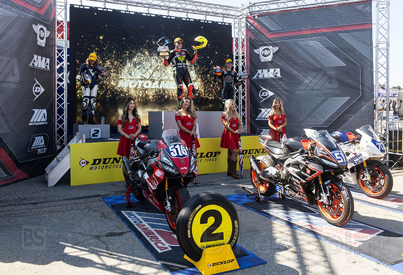 Τρία Aprilia RS 660 στο βάθρο του Twins Cup του MotoAmerica στην πίστα της Laguna Seca.