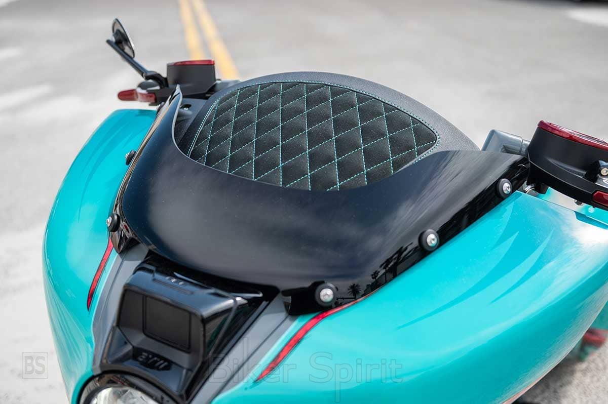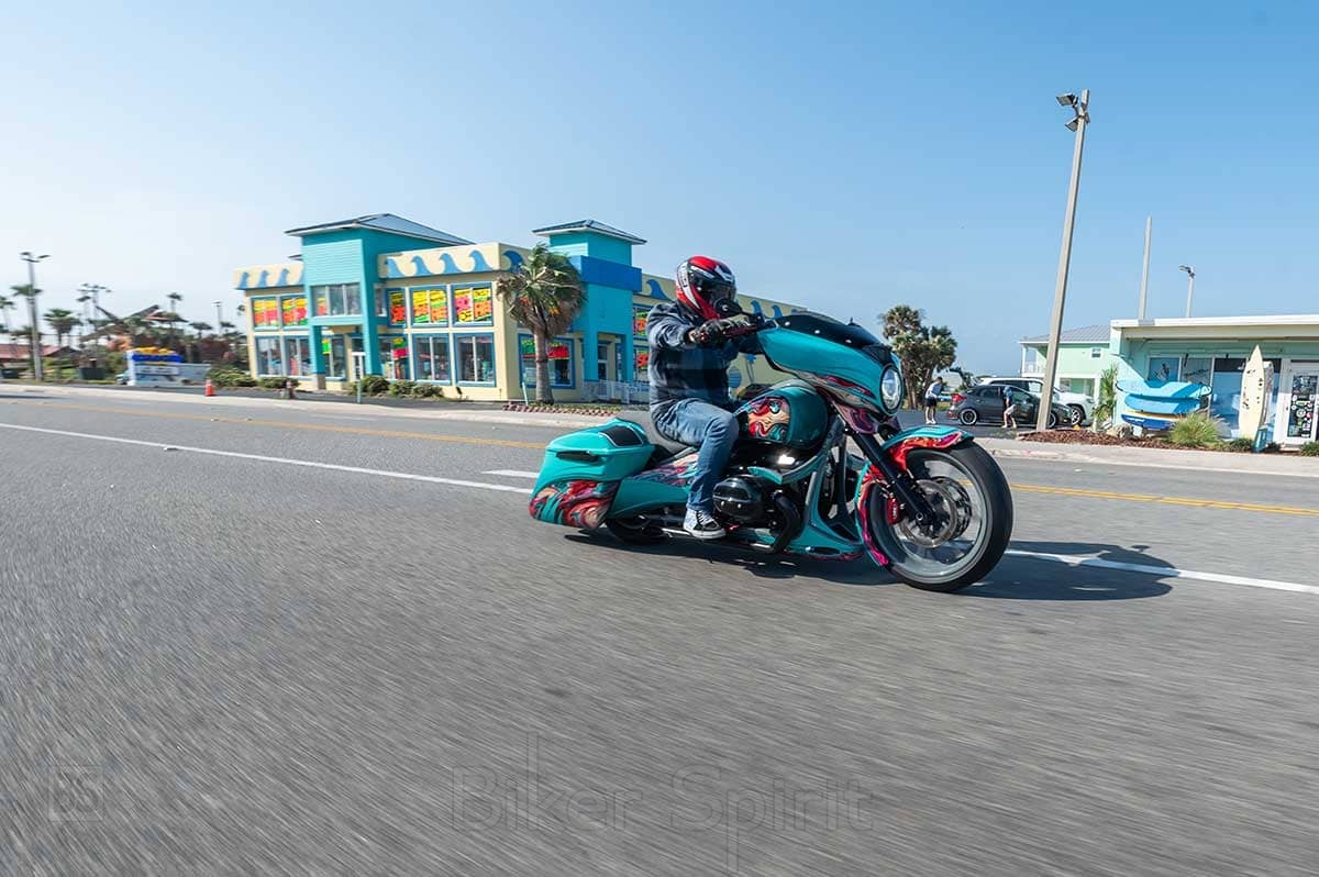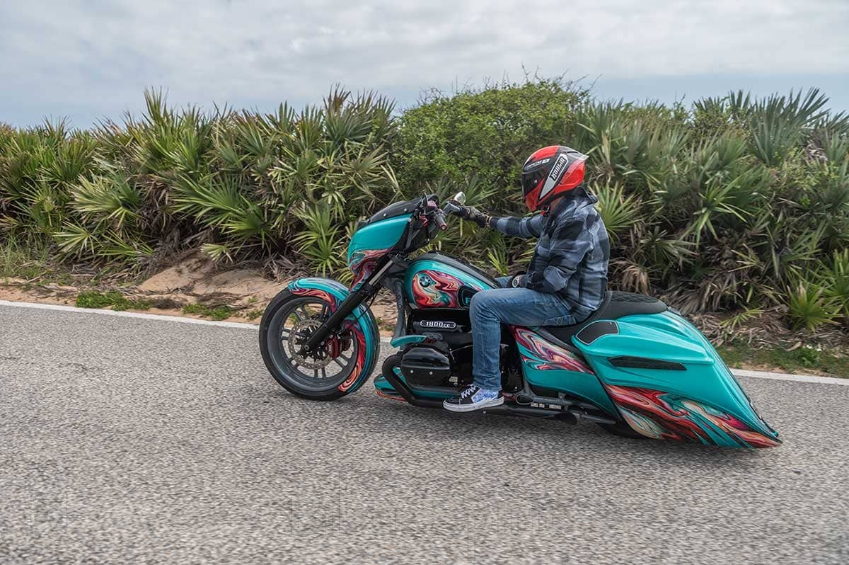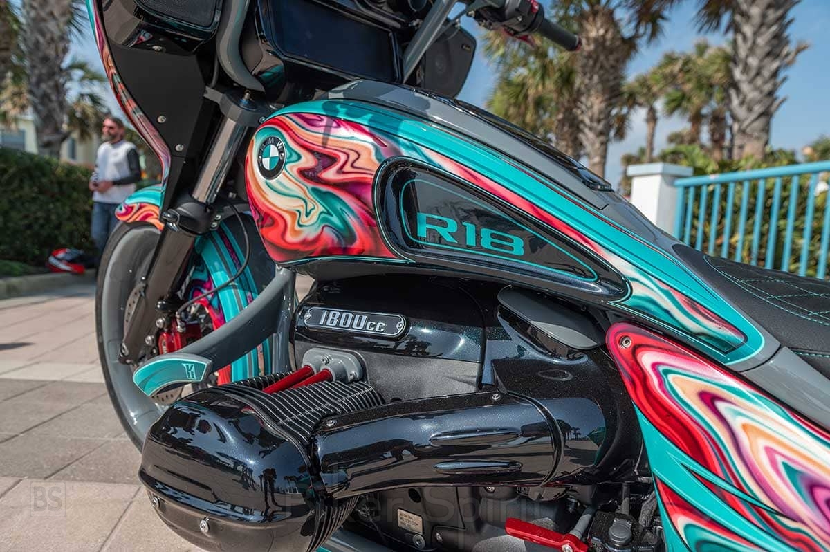 Για αυτό το project, οι χρωματικές διαβαθμίσεις έγιναν με πιστόλι ψεκασμού με ημιδιαφανές χρώμα. Η έμπνευση γι’ αυτό ήταν η ανάμειξη των χρωστικών ουσιών στη βαφή και ιδιαίτερα ο τρόπος με τον οποίο σχηματίζονται ραβδώσεις στο γαλακτώδες βασικό χρώμα όταν αναδεύεται για πρώτη φορά. Το αποτέλεσμα ταιριάζει άριστα στην φιλοσοφία της εβδομάδας μοτοσικλέτας Daytona, όπου τα περίπλοκα και πολύχρωμα σχέδια χρωμάτων είναι κάτι παραπάνω από ένα ελκυστικό ντιζάιν.
