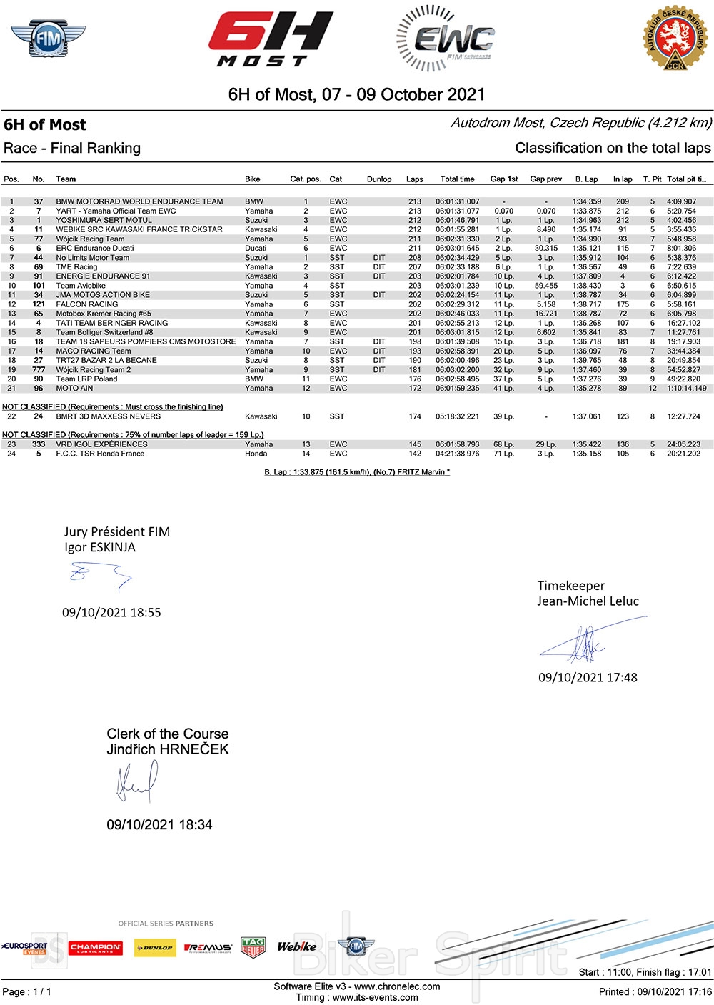 Με την μικρότερη διαφορά στην ιστορία του Endurance, μόλις 70 χιλιοστά του δευτερολέπτου, την νίκη πήρε η BMW Motorrad World Endurance Team μπροστά από την YART – Yamaha Official EWC Team στον τερματισμό του 6ωρου αγώνα στο Most.