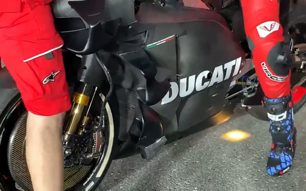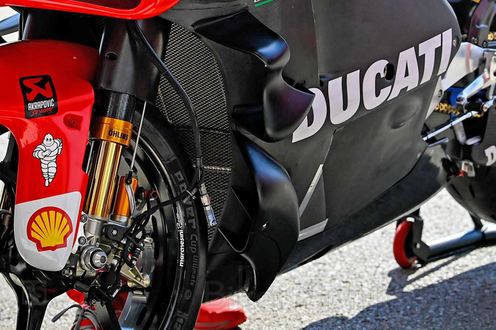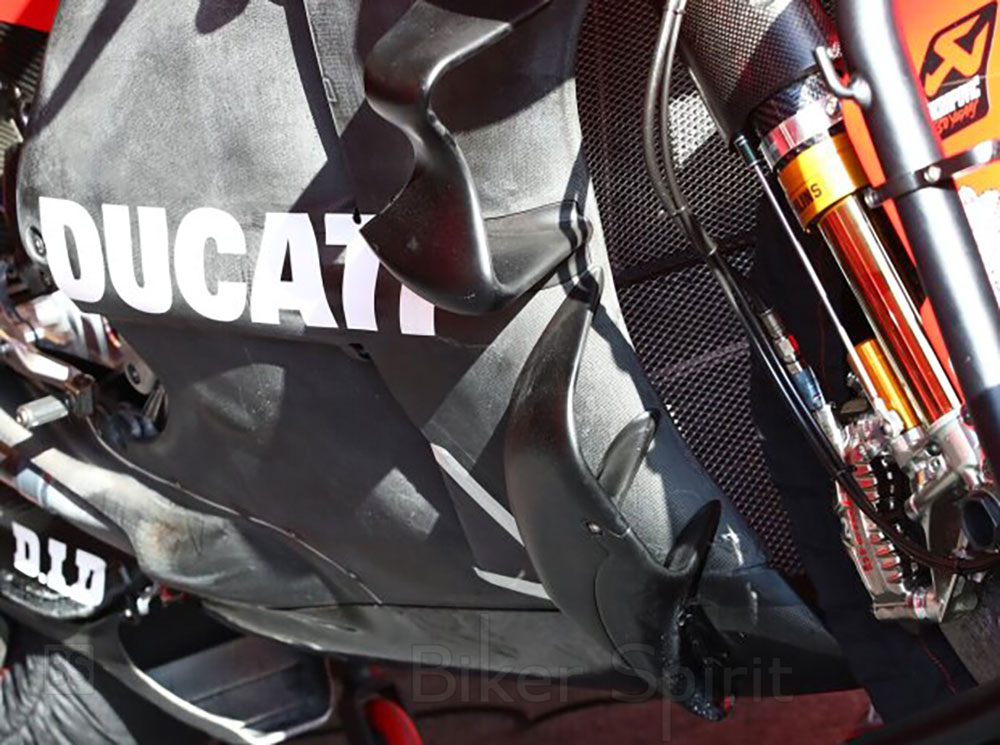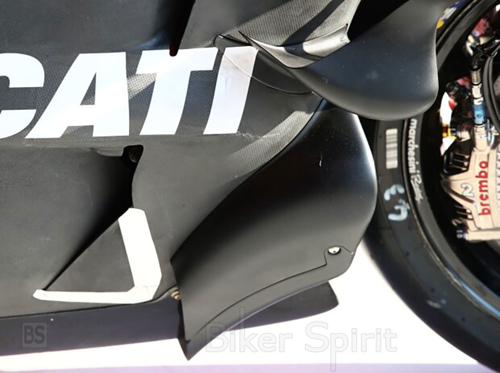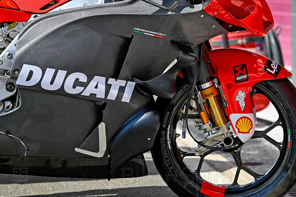 Στη Ducati, η νέα αεροτομή τράβηξε όλα τα βλέμματα. Πίσω από το μπροστινό ελαστικό υπάρχουν δύο νέα στοιχεία στην κάτω πλευρά που δεν έχουν φανεί ποτέ σε καμία άλλη μάρκα. «Είμαστε πάντα χαρούμενοι όταν μπορούμε να δείξουμε νέα πράγματα», είπε ο διευθυντής της ομάδας Davide Tardozzi με χαμόγελο.