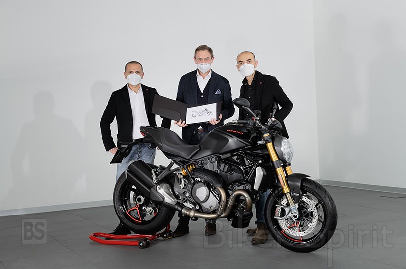 Μία επετειακή Ducati Monster, η υπ’ αριθμόν 350.000, παραδόθηκε στον τυχερό ιδιοκτήτη της. Πρόκειται για μία Monster 1200 S “Black on Black”, την οποία παρέδωσε ο ίδιος ο Claudio Domenicali, CEO της Ducati και ο διευθυντής του Ducati Design Center, Andrea Ferraresi, στον Ducatista ιδιοκτήτη της, τον κ. Sebastien Francois Yves Hervé De Rose.