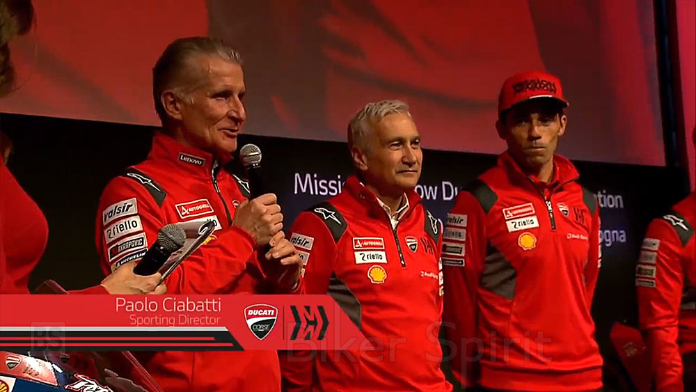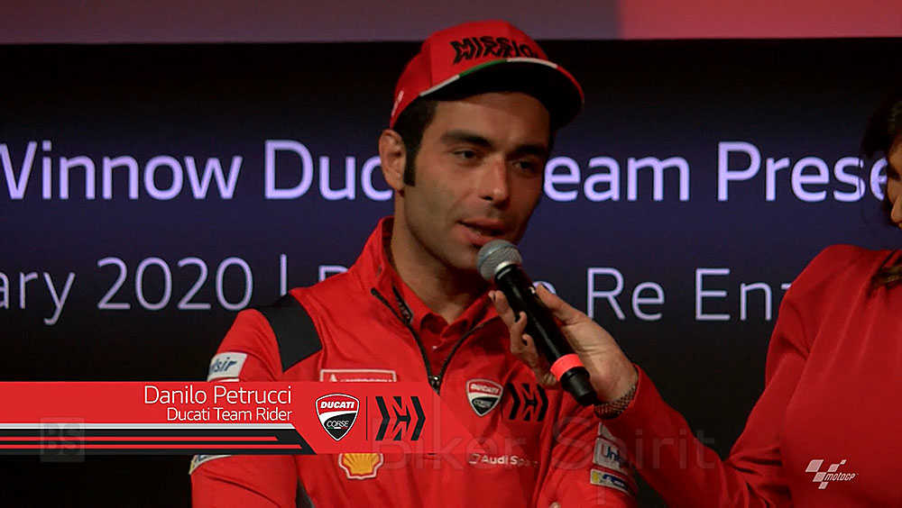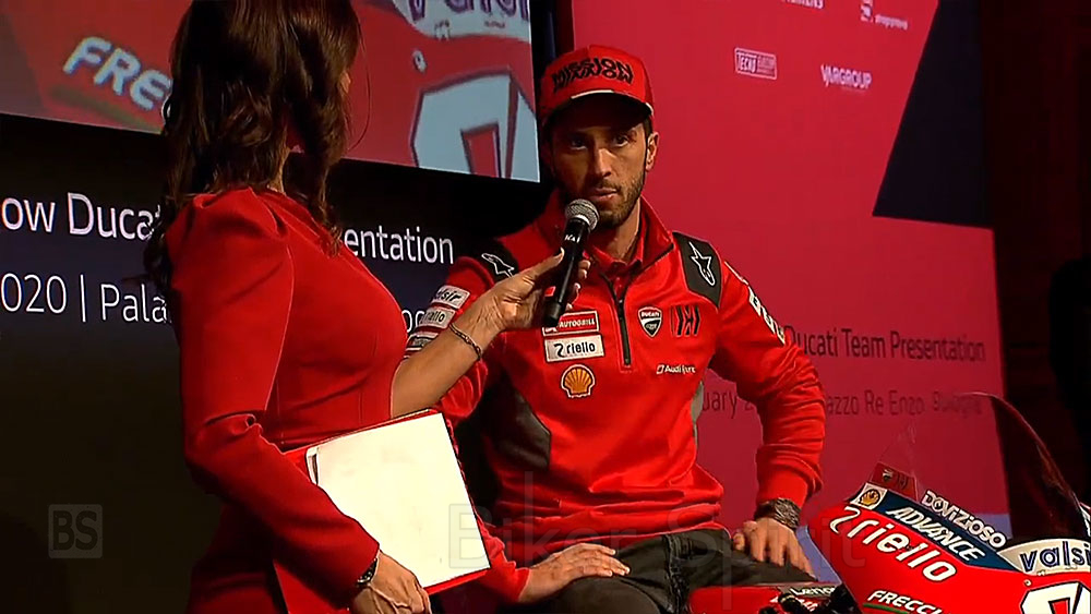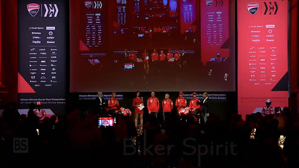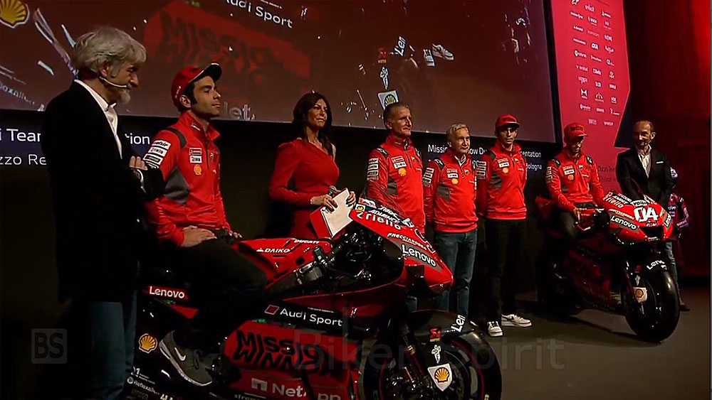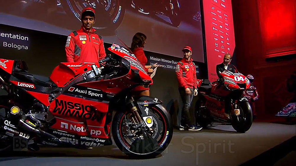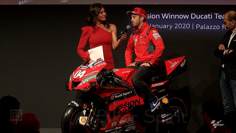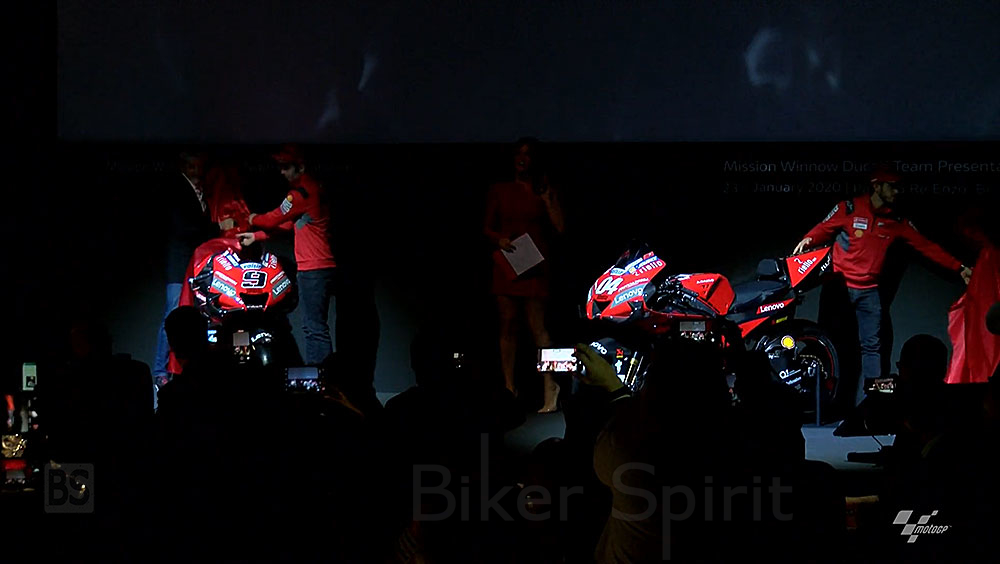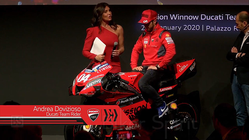 Κατά τη διάρκεια της παρουσίασης, οι αναβάτες Andrea Dovizioso και Danilo Petrucci, μαζί με τον CEO της Ducati Motor Holding Claudio Domenicali και τον γενικό διευθυντή της Ducati Corse Luigi Dall’Igna, παρουσίασαν τα νέα χρώματα των μοτοσυκλετών Desmosedici GP20 που η ιταλική ομάδα θα έχει στο Παγκόσμιο Πρωτάθλημα MotoGP 2020 .