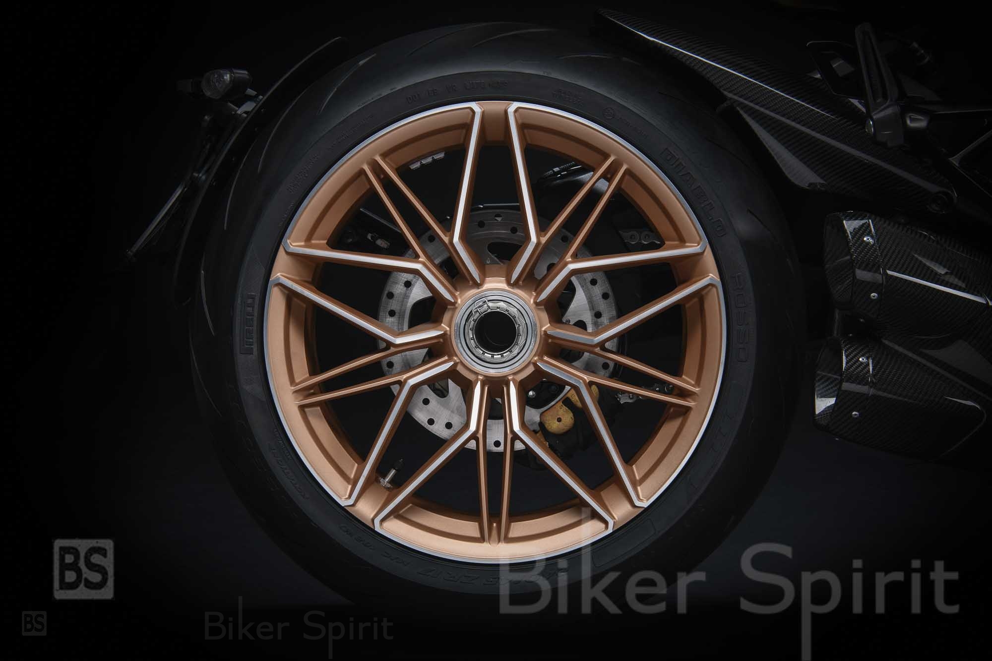 Οι σφυρηλατημένοι τροχοί και τα εξαρτήματα από ανθρακονήματα επιτρέπουν στο Diavel 1260 Lamborghini να έχει βάρος στεγνό μόνο 220 κιλά.