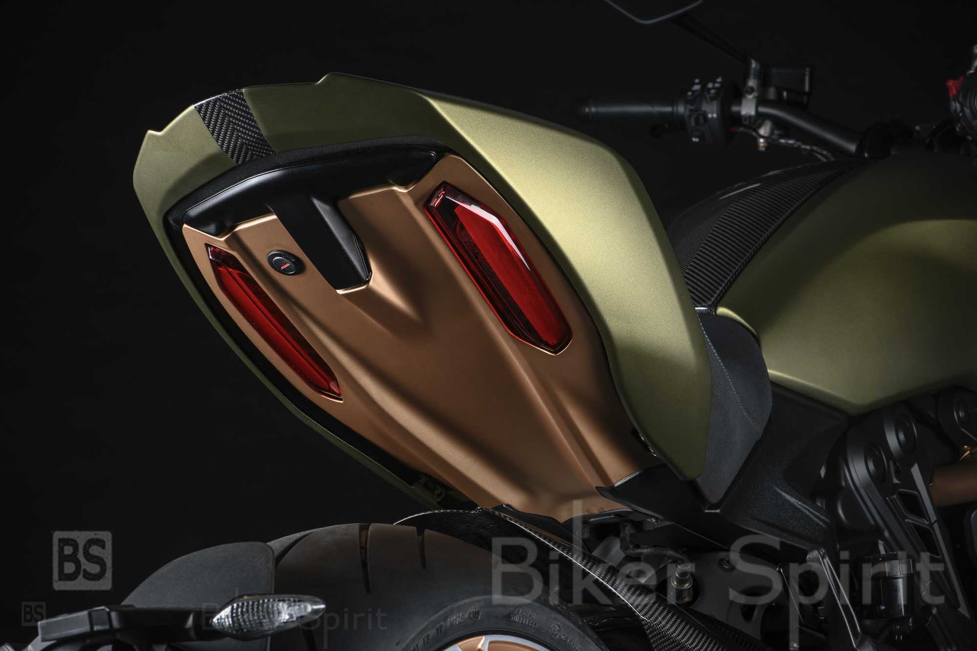 Άλλα σημαντικά στοιχεία αναγνώρισης του σχεδιασμού Lamborghini είναι το εξάγωνο και το μοτίβο “Y”. Αυτή η ειδική έκδοση του Diavel αποτίει φόρο τιμής στον πρώτο σε σχήμα εξάτμισης και το δεύτερο χάρη στις αισθητικές λεπτομέρειες που δημιουργούνται στην σέλα.