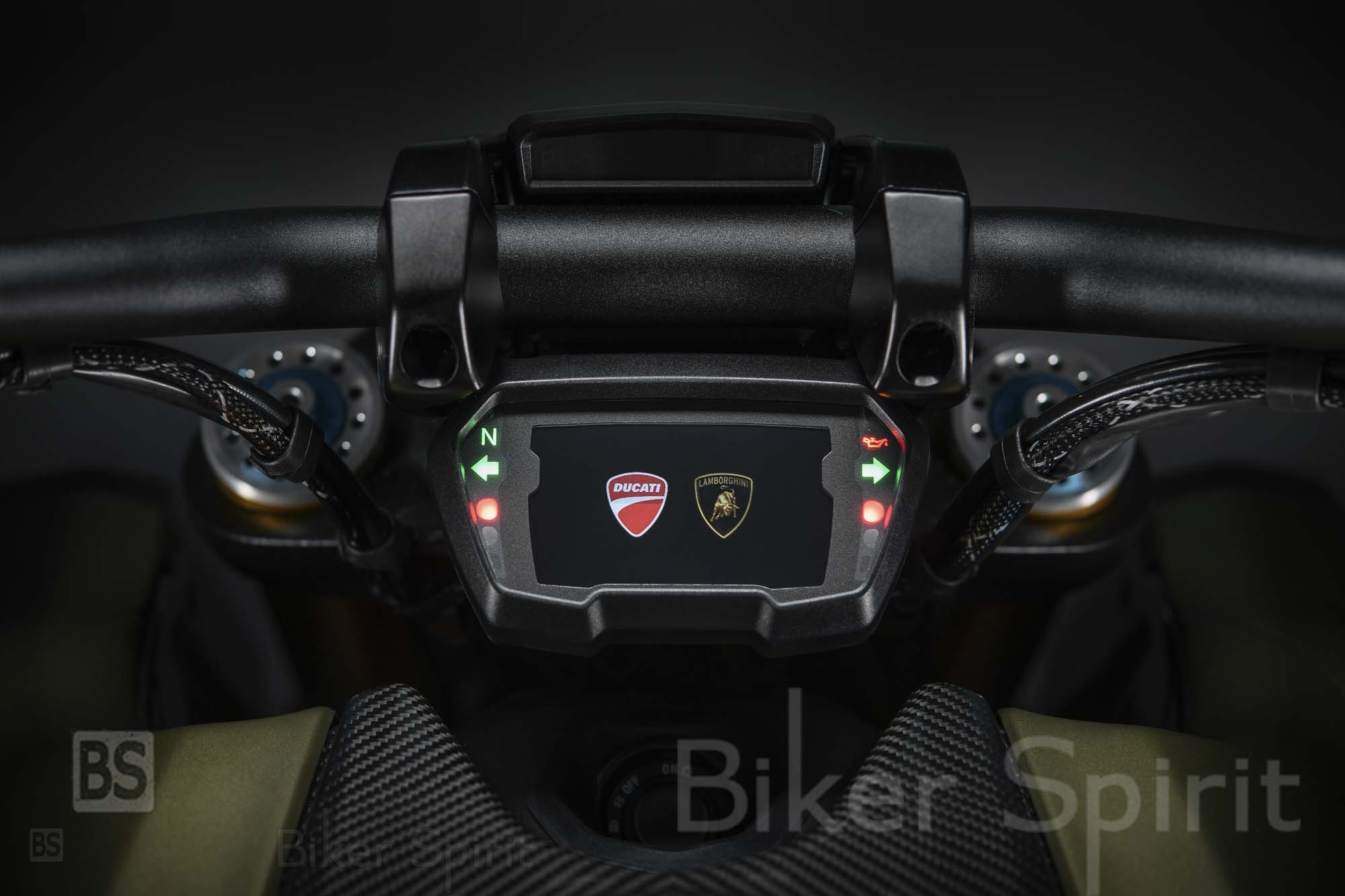 Η προσοχή στη λεπτομέρεια που εφαρμόζεται σε αυτό το μοντέλο μπορεί να φανεί αμέσως από τη φάση της εκκίνησης, όταν τα λογότυπα των δύο εμπορικών σημάτων εμφανίζονται στον ταμπλό με την οθόνη TFT, συνοδευόμενη από τη σιλουέτα του Diavel Lamborghini.