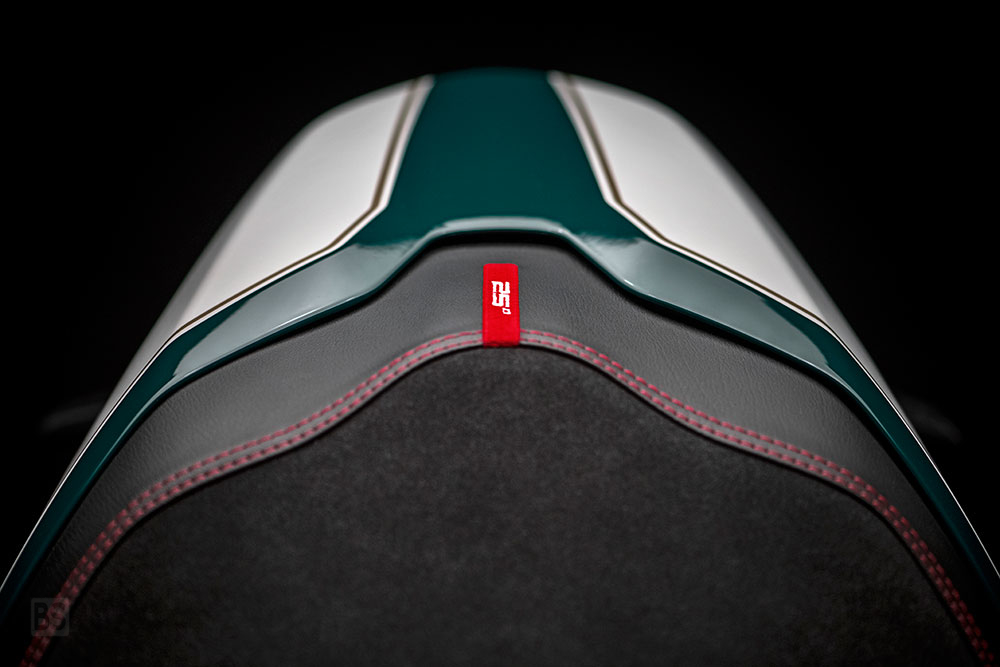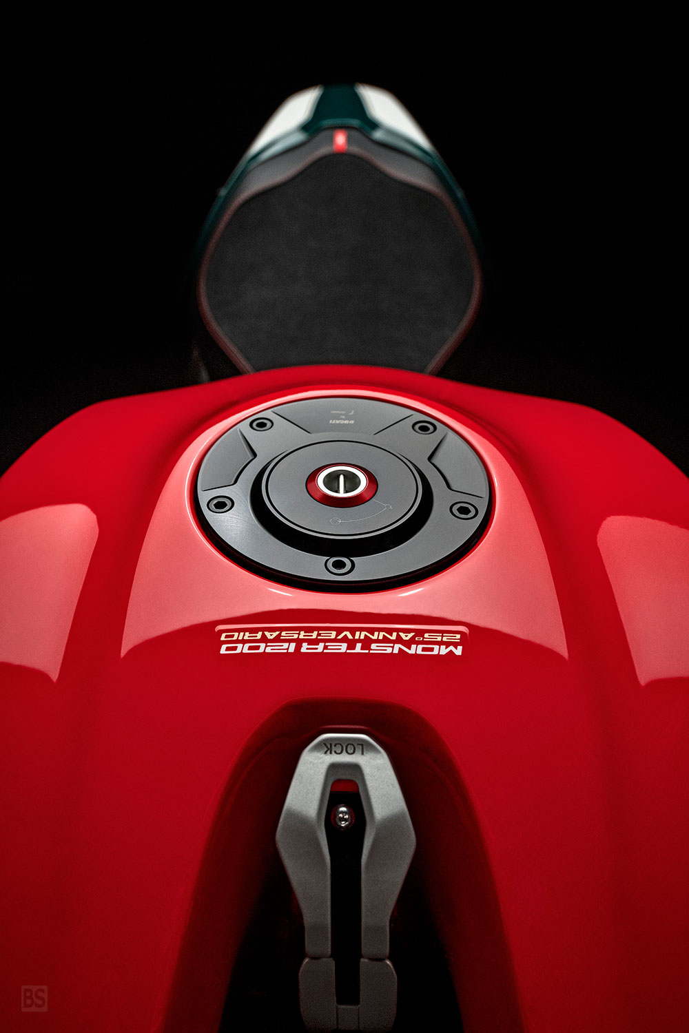 Το Monster 1200 25 ° Anniversario έρχεται επίσης με κουκούλα, διακοσμημένη με το συγκεκριμένο λογότυπο αυτής της ειδικής περιορισμένης έκδοσης.