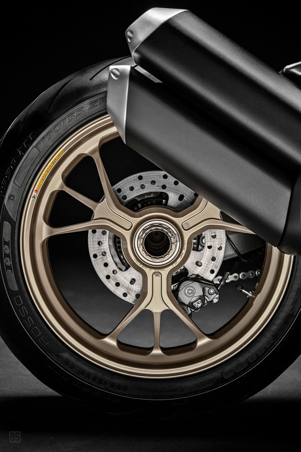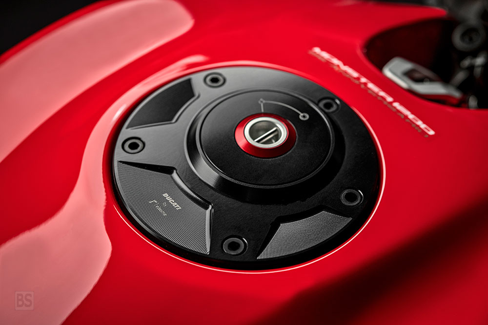 Το χρυσοκίτρινο πλαίσιο και οι ζάντες Marchesini με ακτίνες W στο ίδιο χρώμα είναι ένα ακόμα χαρακτηριστικό γνώρισμα αυτού του Monster, το οποίο έχει επίσης πολλές άλλες αξιόλογες λεπτομέρειες που κατασκευάζονται από συμπαγή στοιχεία, όπως οι καθρέφτες, οι ξυστρες του πλαισίου, τα τελικά βάρη του τιμονιού και το καπάκι βενζίνης.
