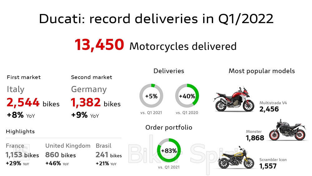 · 13.450 μοτοσυκλέτες παραδόθηκαν στους ενθουσιώδεις πελάτες της Ducati σε όλο τον κόσμο τους πρώτους τρεις μήνες του 2022, παρουσιάζοντας άνοδο 5% σε σύγκριση με το 2021