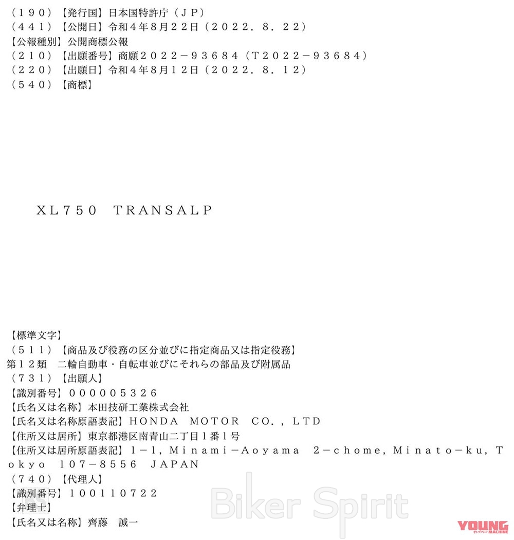 Στις 12 Αυγούστου 2022, η Honda Motor Co., Ltd. υπέβαλε αίτηση για το εμπορικό σήμα «XL750 TRANSALP», που είναι αναμφίβολα είναι το νέο επίσημο όνομα του νέου μοντέλου και οι πληροφορίες κυκλοφόρησαν στις 22 Αυγούστου.