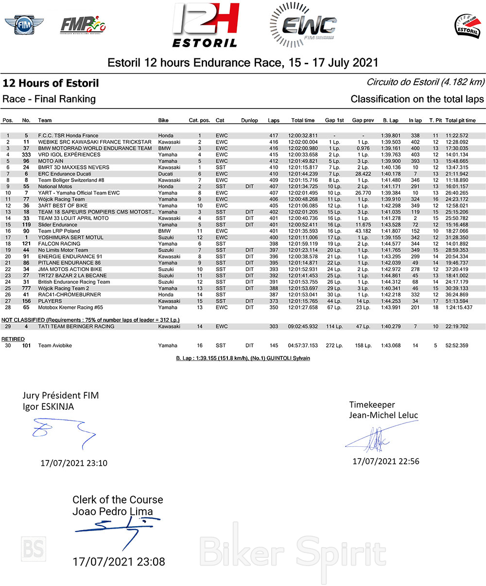Οι λάτρεις των αγώνων αντοχής δεν θα ξεχάσουν ευκολά τον 12ωρο του Εστορίλ. Τα φαβορί ήταν στο προβάδισμα στην αρχή του αγώνα, όταν αρχίσαν οι ανατροπές! Σε μια καυτή πίστα και υπό την πίεση των αντιπάλων τους, οι πρωτοπόροι δεν άντεξαν και είχαν πτώσεις ο ένας μετά τον άλλο. Η BMW Motorrad World Endurance Team, η Yoshimura SERT Motul και μετά η YART – Yamaha Official EWC Team είχαν πτώσεις προτού φτάσουν στα μισά του αγώνα. Προς το τέλος του αγώνα, όταν η Webike SRC Kawasaki France Trickstar φάνηκε να είναι σταθερά στο προβάδισμα του αγώνα, έμειναν από καύσιμα και έτσι στερήθηκαν τη νίκη 1.30 ώρα πριν τον τερματισμό.