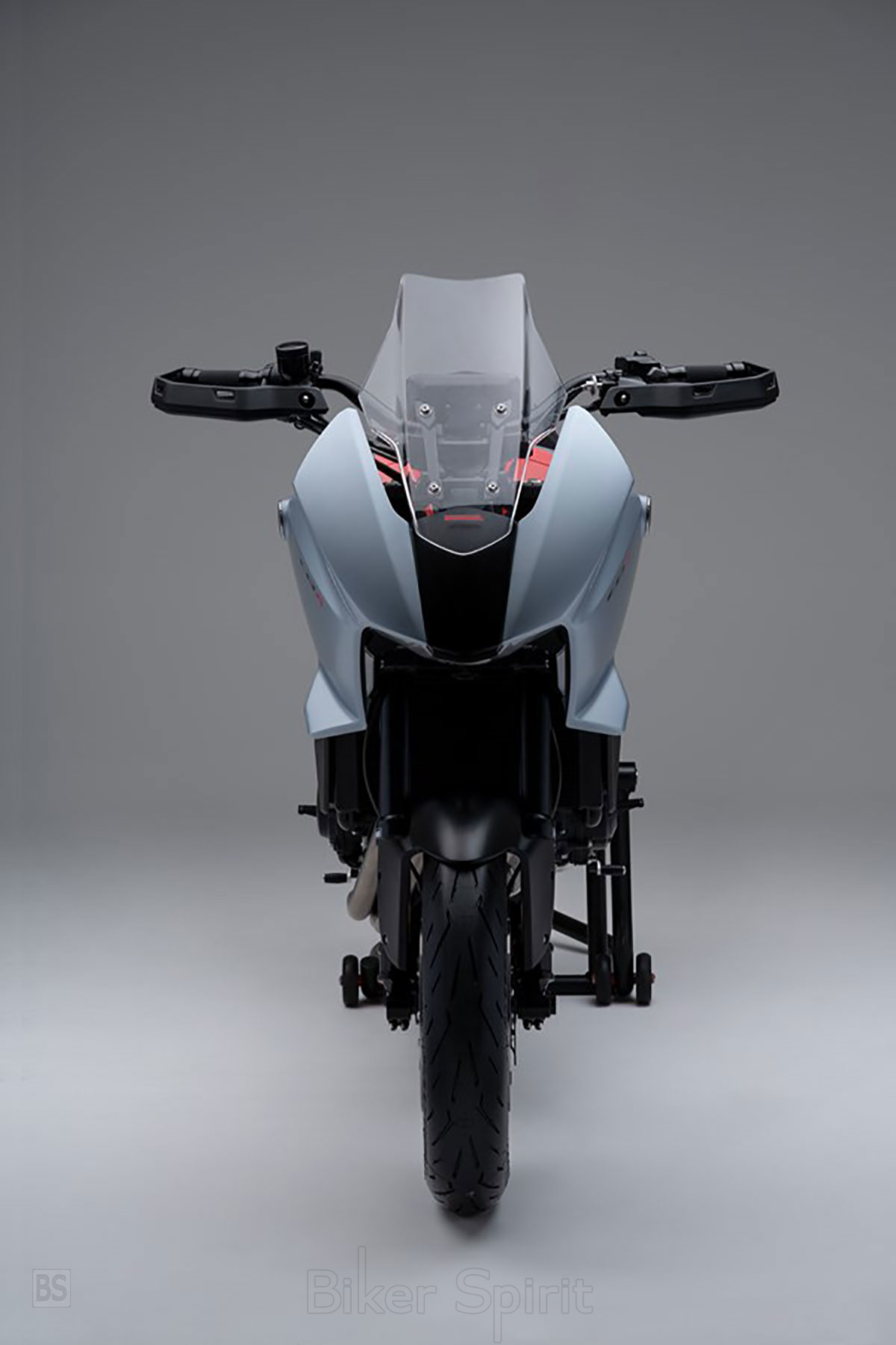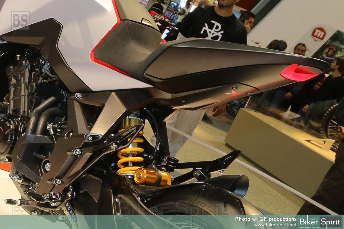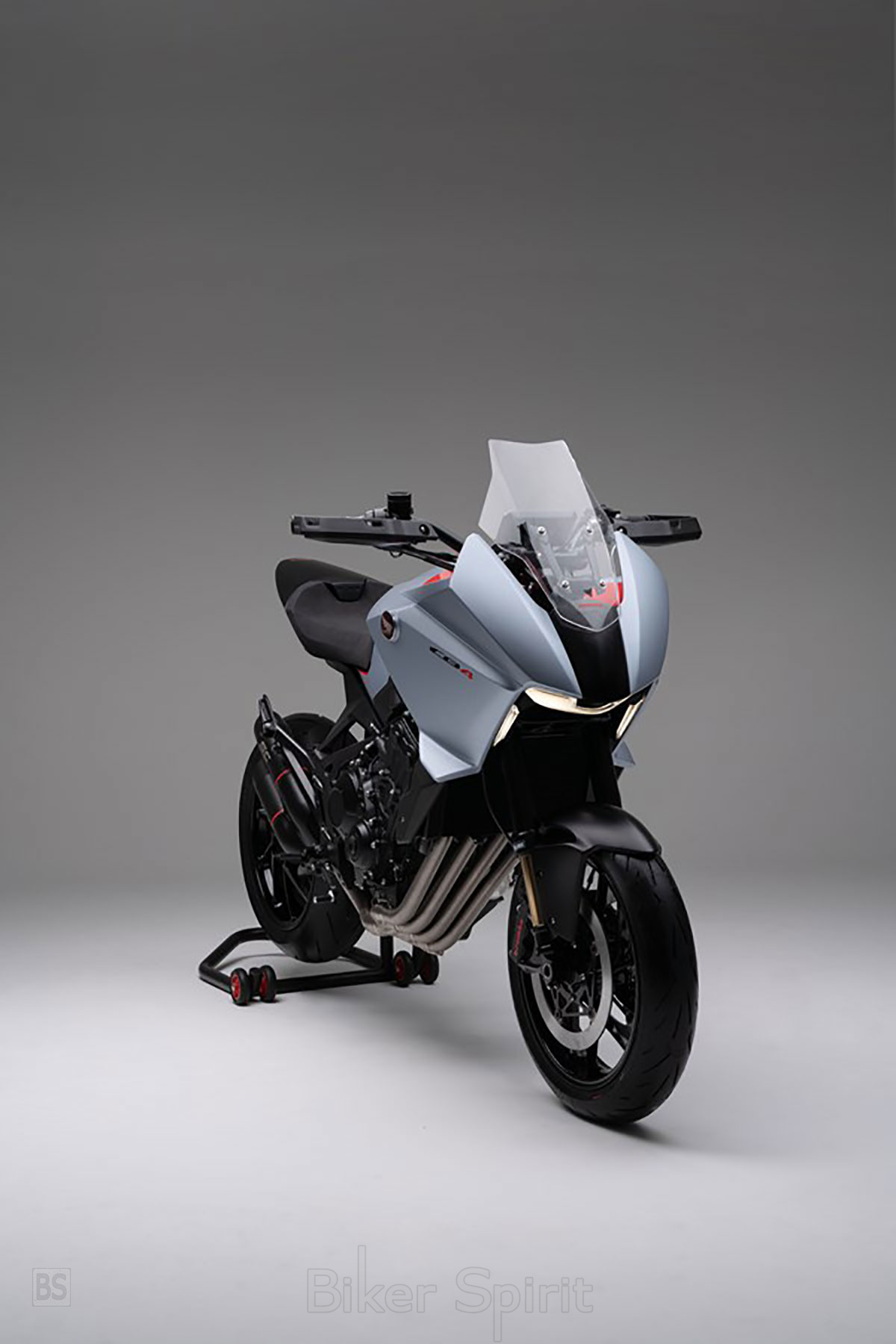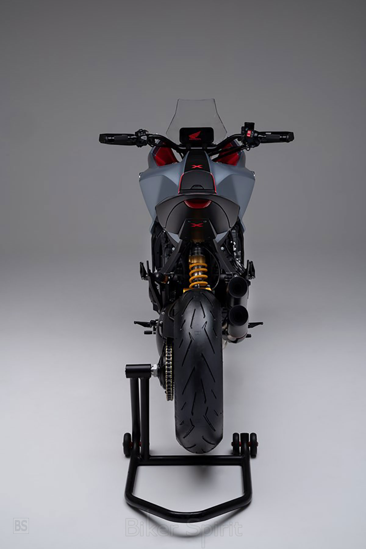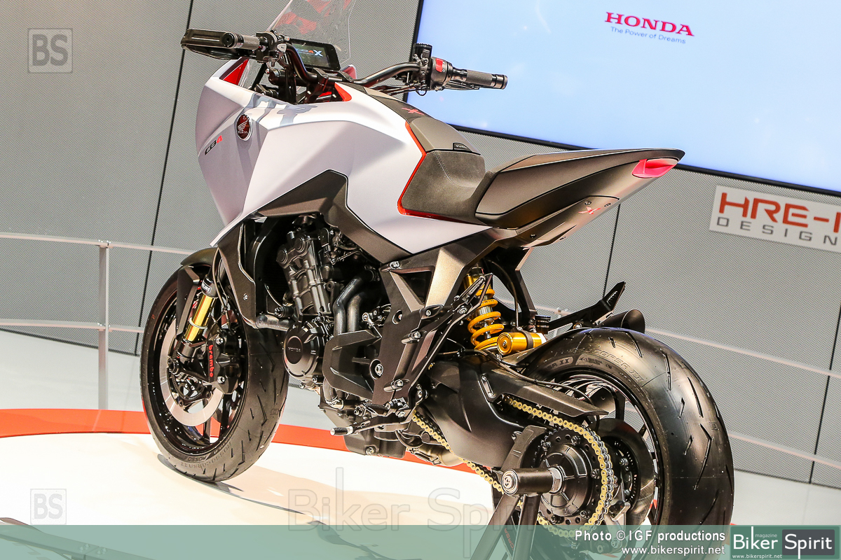 Ο κινητήρας του είναι ένας κλασικός τετρακύλινδρος κινητήρας – η βασική υπογραφή της Honda. Το ρεζερβουάρ έχει μια “κίνηση” προς τα εμπρός, όπως μια κόμπρα έτοιμη να επιτεθεί στο θήραμά της, ενώ η οθόνη είναι πλήρως ρυθμιζόμενη και ενσωματώνεται στο τιμόνι. Και ο προβολέας είναι τοποθετημένος σαν ένα διαμάντι, εισάγοντας επιθετική πολυπλοκότητα παράλληλα με τα Daytime Running Lights (DRL). Ένα όμορφο υποπλαίσιο αλουμινίου στηρίζει την κοντή, αιχμηρή ουρά ενώ ο μπροστινός τροχός 17 ιντσών μεγιστοποιεί την ακρίβεια της διεύθυνσης.
