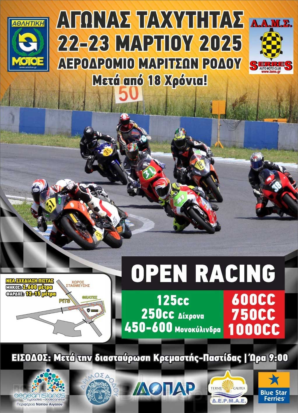 Η ΛΑΜΣ, σε συνεργασια με τον ΡΟΔΙΑΚΟ ΣΥΛΛΟΓΟ ΑΥΤΟΚΙΝΗΣΗΣ διοργανώνει αγώνα ταχύτητας μοτοσυκλετών στις 22-23 / Μαρτίου 2025 στο αεροδρόμιο Μαριτσων – Ροδου.