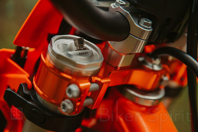 Η μεγαλύτερη βελτίωση στο KTM 350 EXC-F WESS φαίνεται με την ενσωμάτωση της τεχνολογίας πιρουνιού WP XACT 48 mm για πρώτη φορά σε μια μηχανή KTM Enduro. Ειδικά σχεδιασμένο για χρήση υψηλής απόδοσης εκτός δρόμου, η τελευταία καινοτομία από τη WP επιτρέπει εύκολες και γρήγορες ρυθμίσεις μέσω της βαλβίδας πίεσης αέρα για προφόρτιση (στα αριστερά) ή των κλικ εύκολης πρόσβασης για απόσβεση (στα δεξιά), βελτιστοποιώντας τις ρυθμίσεις ανάρτησης για διαφορετικές δοκιμές ή τις μεταβαλλόμενες συνθήκες μιας μεγάλης ημέρας οδήγησης. Επιπλέον, το πιρούνι WP XACT εισάγει μεγάλη εξοικονόμηση βάρους σε σύγκριση με τα εναλλακτικά συστήματα.