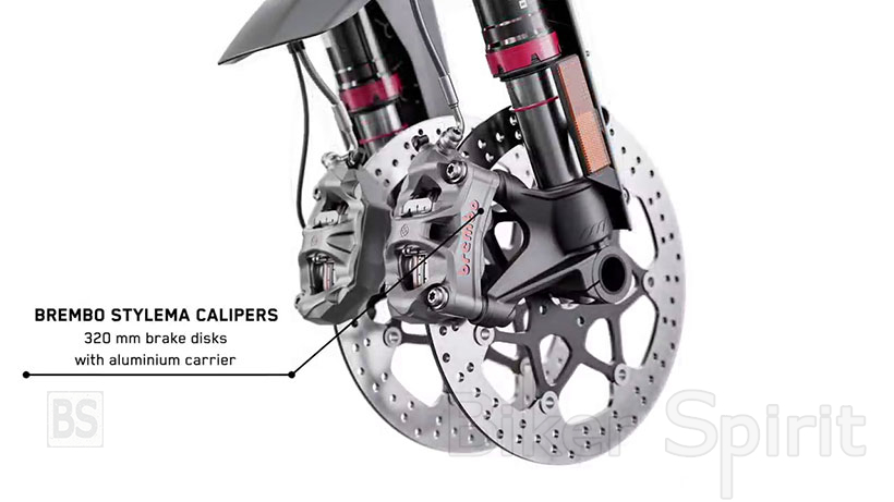 Από την πλευρά τους, τα φρένα έχει τους φανταστικούς δακτυλιοειδείς δακτύλιους Brembo Stylema , με μια ακτινική αντλία Brembo MCS .