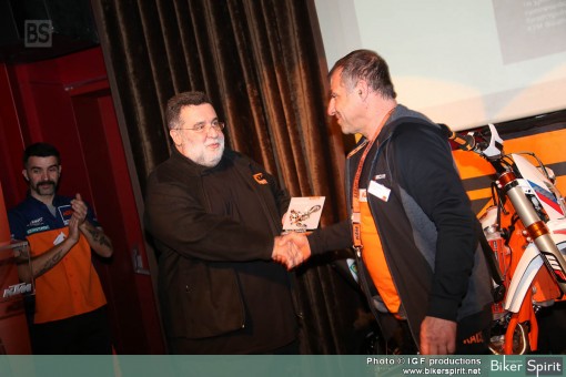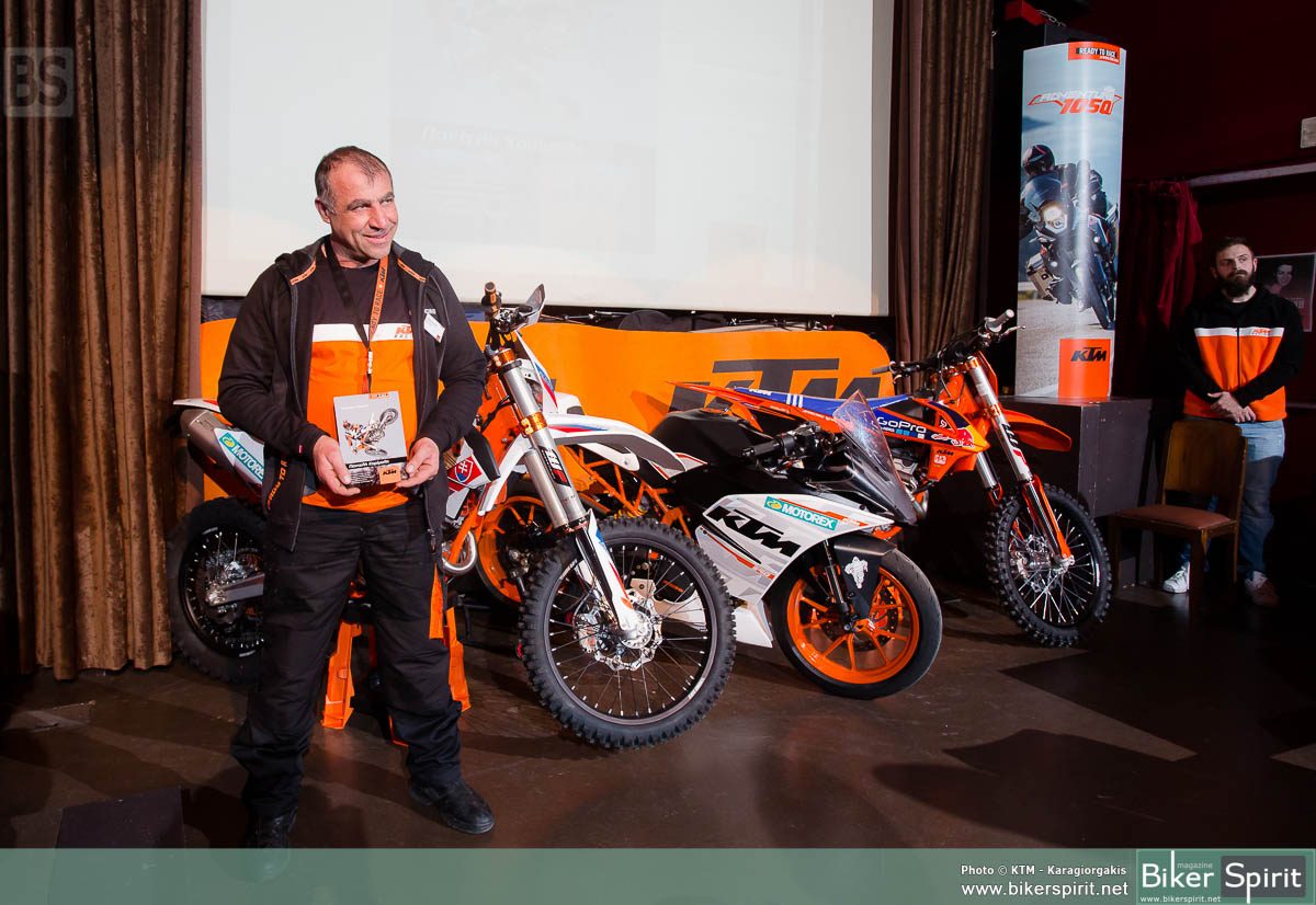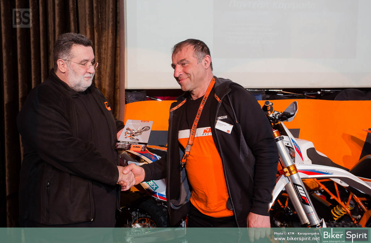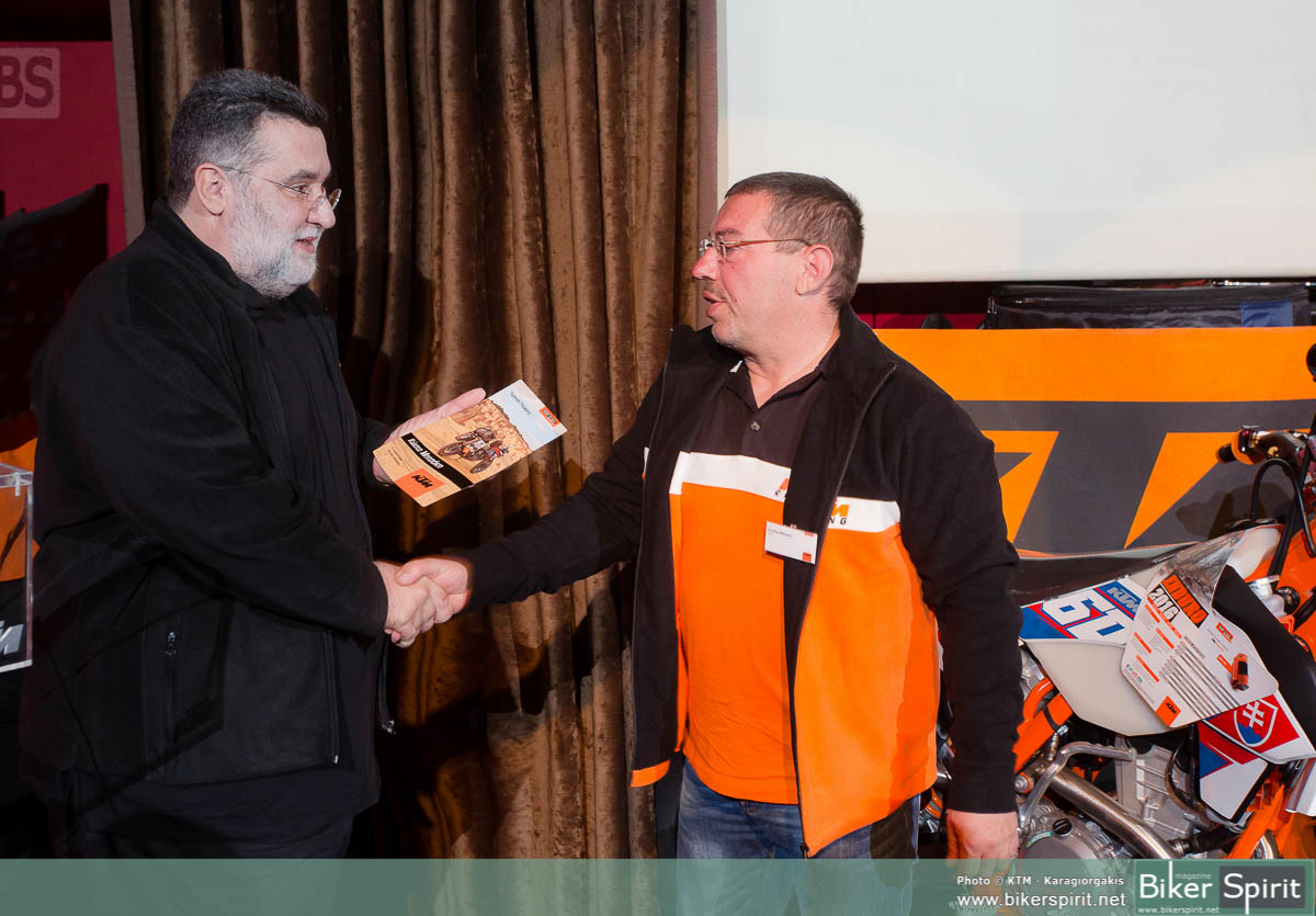 Στο τέλος η KTM South East Europe κλείνοντας αυτήν την εκδήλωση βράβευσε τρεις ανθρώπους, για την προσφορά τους στην KTM. Τον ταξιδευτή Κώστα Μητσάκη, τον Δημήτρη Τσακατσώνη για την εταιρεία Makina Α.Ε. και για την πολυετή συνεργασία με την οικογένεια Τσακατσώνη και τέλος τον Παντελή Καρίμαλη που πάντα είναι ο άνθρωπος πανταχού παρόν και πρόθυμος να βοηθήσει την ΚΤΜ όπου και όποτε του ζητηθεί. Αξίζουν συγχαρητήρια στην KTM για την αντιμετώπιση των πραγμάτων στην Ελλάδα, αφού δρα και κινείτε όπως γράψαμε και στην αρχή μέσα στα Διεθνή πρότυπα κάτι που είναι σπάνιο για την Ελλάδα