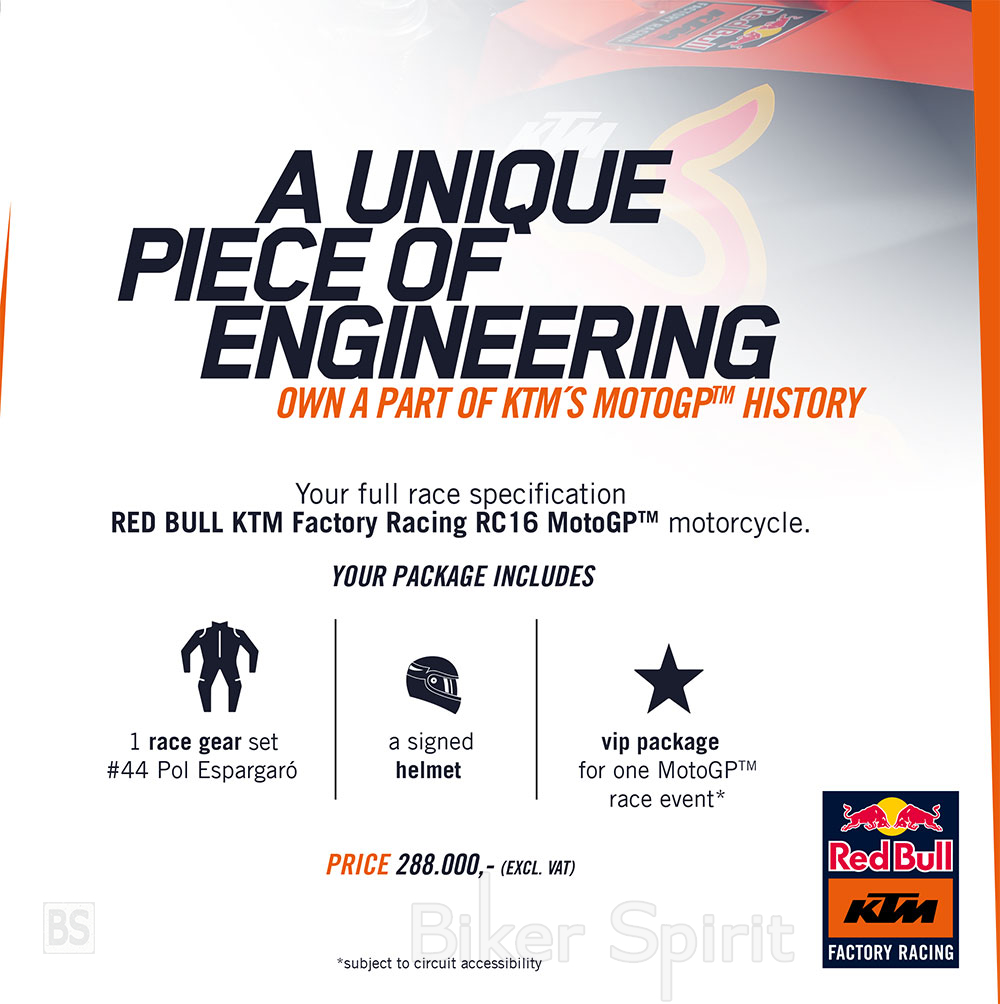 Τώρα είναι η σειρά της KTM να πουλήσει δύο μοτοσυκλέτες RC16 της σεζόν του 2019, μια μοτοσικλέτα που έχει δώσει τις μεγαλύτερες ικανοποιήσεις στην κορυφαία κατηγορία στην αυστριακή εταιρεία. Μια μοτοσυκλέτα με την οποία ο Pol Espargarò κέρδισε την 2η θέση στη εκκίνηση στο Misano, και την 11 θέση στην τελική θέση της βαθμολογίας.