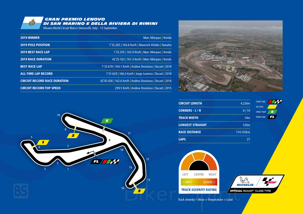 Η πίστα του Misano έχει μήκος 4.226 μετρά και βρίσκεται κοντά στην ακτογραμμή της Αδριατικής Ριβιέρας. Αποτελεί μια τεχνική πίστα και η σχεδίασή της περιλαμβάνει ανοικτές στροφές με υψηλή ταχύτητα, κλειστές στροφές καθώς και μια σύντομη ευθεία, με αποτέλεσμα να υπάρχουν μεγάλες απαιτήσεις από τα μπροστινά ελαστικά. Τα MICHELIN Power Slick που έχουν επιλεχθεί για τους δυο αυτούς αγώνες, σε μια πίστα με νέο ασφαλτοτάπητα – έχουν γίνει δοκιμές νωρίτερα φέτος από τη Michelin- είναι έτοιμα να προσφέρουν τους οδηγούς και τις μοτοσυκλέτες τους τις καλύτερες δυνατές επιδόσεις από τα ελαστικά σε αυτήν την απαιτητική πίστα.