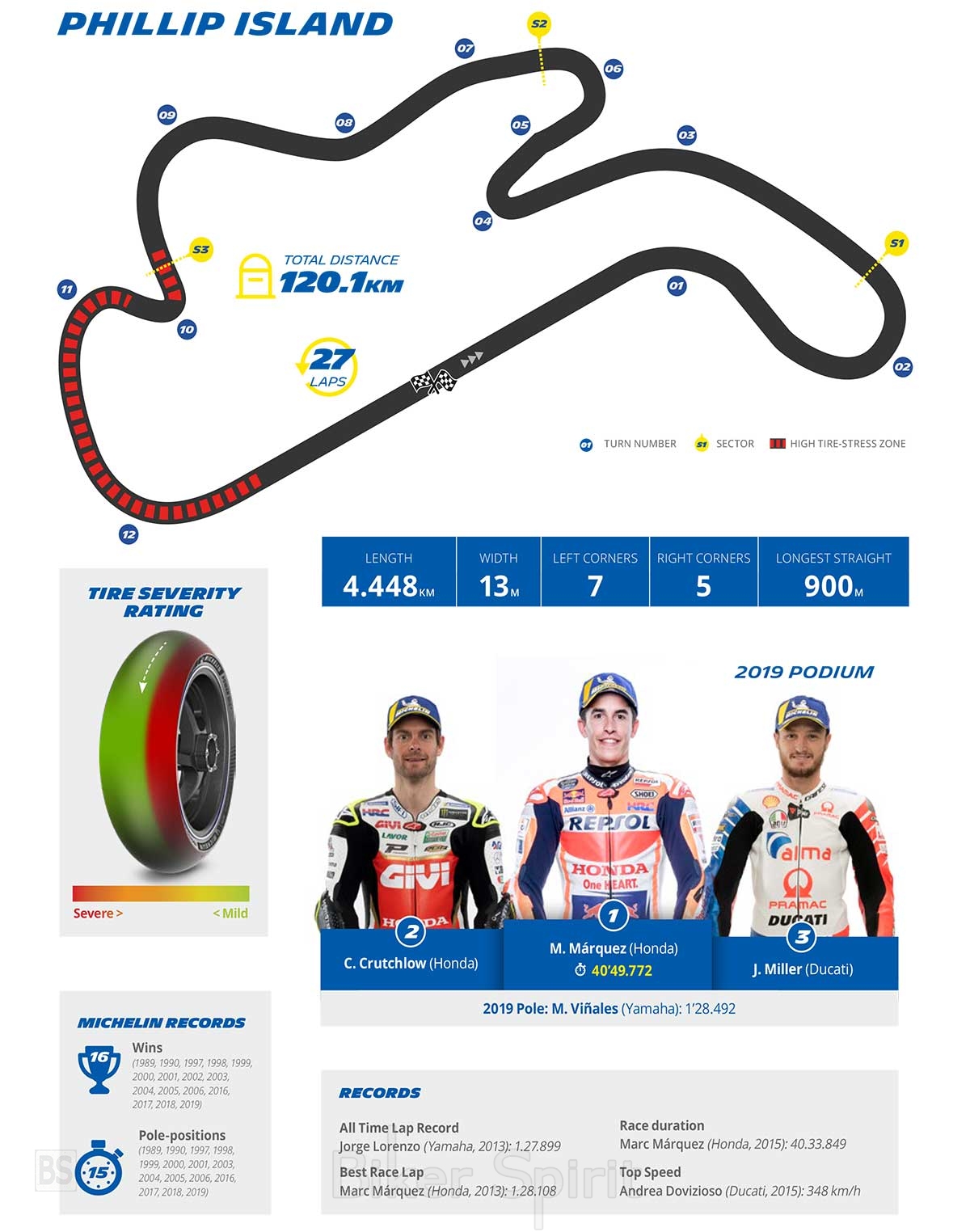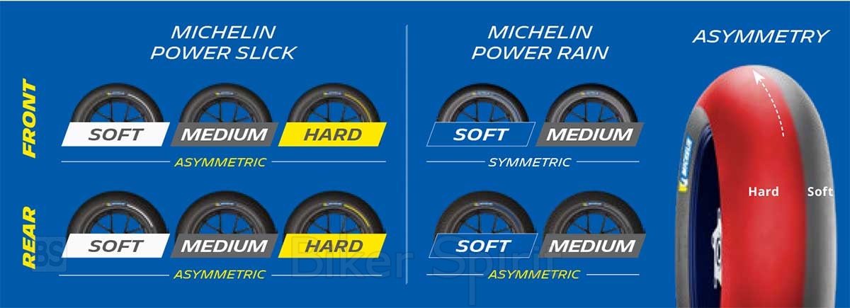 Για το λόγο αυτό, η Michelin έχει σχεδιάσει μια εξειδικευμένη γκάμα ελαστικών, ειδικά για τη συγκεκριμένη πίστα. Τα συγκεκριμένα ελαστικά MICHELIN Power Slick χαρακτηρίζονται ως ελαστικά του Phillip Island, διότι πληρούν τα απαιτούμενα χαρακτηριστικά της πίστας και θα δώσουν στους οδηγούς την εμπιστοσύνη που χρειάζονται για να πιέσουν τα όριά τους. Θα είναι διαθέσιμα σε μαλακό, μεσαίο και σκληρό μείγμα γόμας και για τους δυο τροχούς, όλα ασύμμετρης σχεδίασης – μία από τις τρεις φορές που παρουσιάζεται αυτή η ιδιαιτερότητα σε όλη τη σεζόν, όπως στο Sachsenring και τη Valencia – όπου τα ελαστικά φέρουν πιο σκληρό μείγμα γόμας στην αριστερή πλευρά του πέλματος, για να ανταπεξέλθουν στις απαιτήσεις που υπάρχουν στις άκρες των ελαστικών.