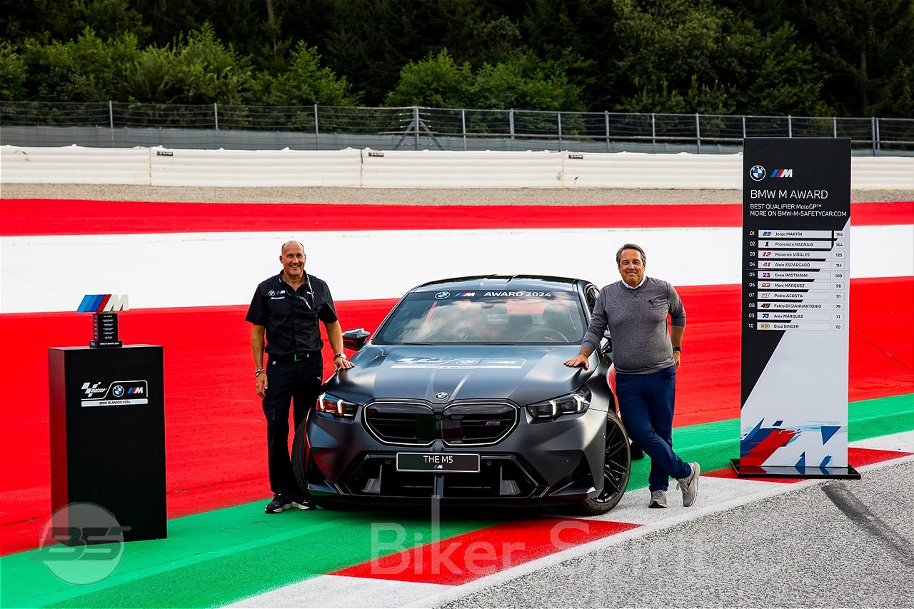 Η BMW M GmbH αποκάλυψε το αυτοκίνητο υψηλών επιδόσεων που θα απονεμηθεί στον ταχύτερο αναβάτη στις κατατακτήριες δοκιμές του MotoGP™ στο τέλος της φετινής σεζόν. Με τη νέα BMW M5 (κατανάλωση ενέργειας, σταθμισμένη, συνδυασμένη: 1,7 – 1,6 l/100 km και 25,5 – 25,0 kWh/100 km κατά το πρότυπο WLTP, εκπομπές CO2, σταθμισμένες, συνδυασμένες: 1,7 – 1,6 l/100 km και 25,5 – 25,0 kWh/100 km σύμφωνα με τον WLTP: 39 – 37 g/km κατά το πρότυπο WLTP- κατανάλωση καυσίμου με αποφορτισμένη μπαταρία: 10,3 – 10,2 l/100 km σύμφωνα με το WLTP- κατηγορίεςCO2: σταθμισμένες, συνδυασμένες B, με αποφορτισμένη μπαταρία G), η BMW M GmbH συνεχίζει την 20ετή και πλέον παράδοση της να τιμά τα επιτεύγματα του νικητή του BMW M Award με ένα πρωτοποριακό και καινοτόμο όχημα της BMW M. Το όχημα του νικητή αποκαλύφθηκε κατά τη διάρκεια του Grand Prix Αυστρίας από τον Dan Rossomondo, Εμπορικό Διευθυντή της κατόχου των εμπορικών δικαιωμάτων του MotoGP™ Dorna Sports, και τον Axel Mittler, Διευθυντή Μάρκετινγκ MotoGP™ της BMW M GmbH.