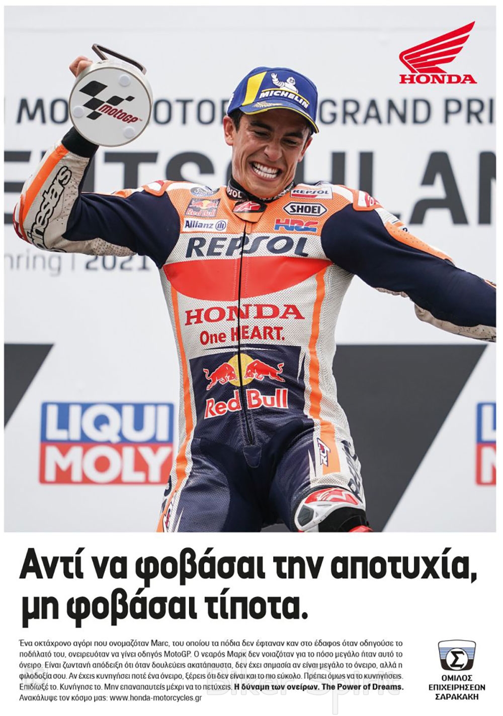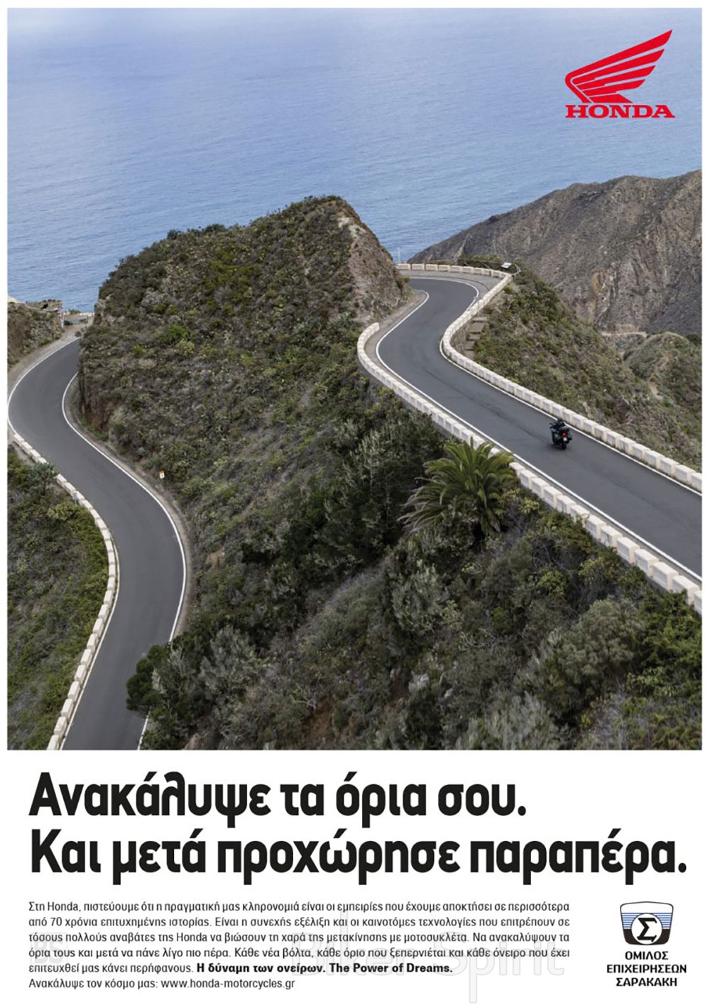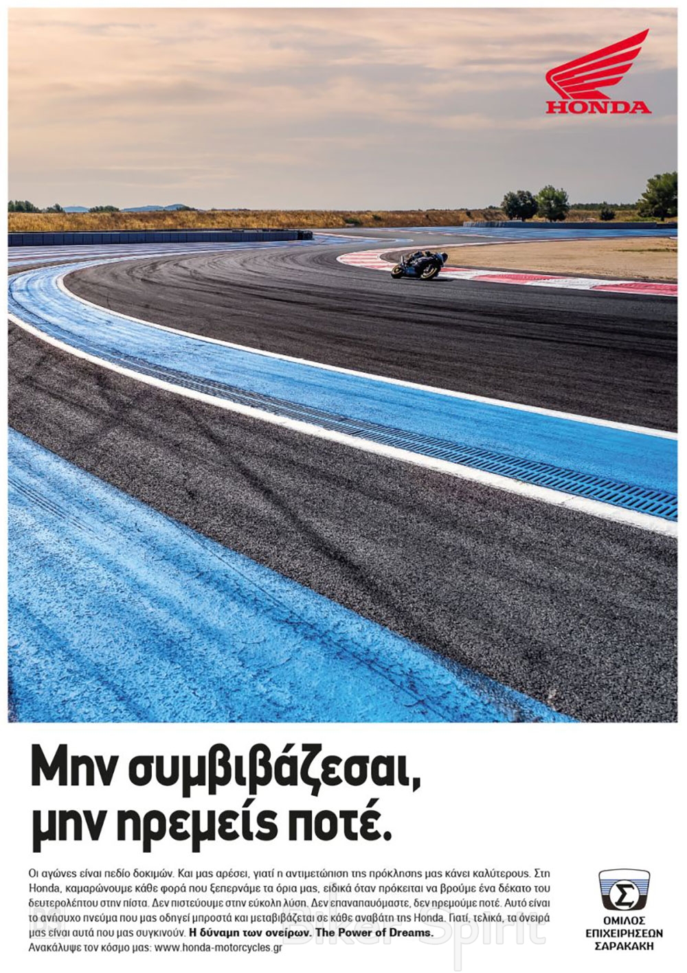Ο Όμιλος Επιχειρήσεων Σαρακάκη και η Honda Moto για το 2022 παρουσιάζουν μία εντυπωσιακή, ιδιαίτερη και σίγουρα διαφορετική διαφημιστική καμπάνια η οποία εστιάζει στους διάσημους Πρεσβευτές – Αγωνιζομένους της Honda Moto παγκοσμίως, την πολύτιμη κληρονομιά της μάρκας καθώς και στην νοοτροπία και το πάθος του αναβάτη-οδηγού.