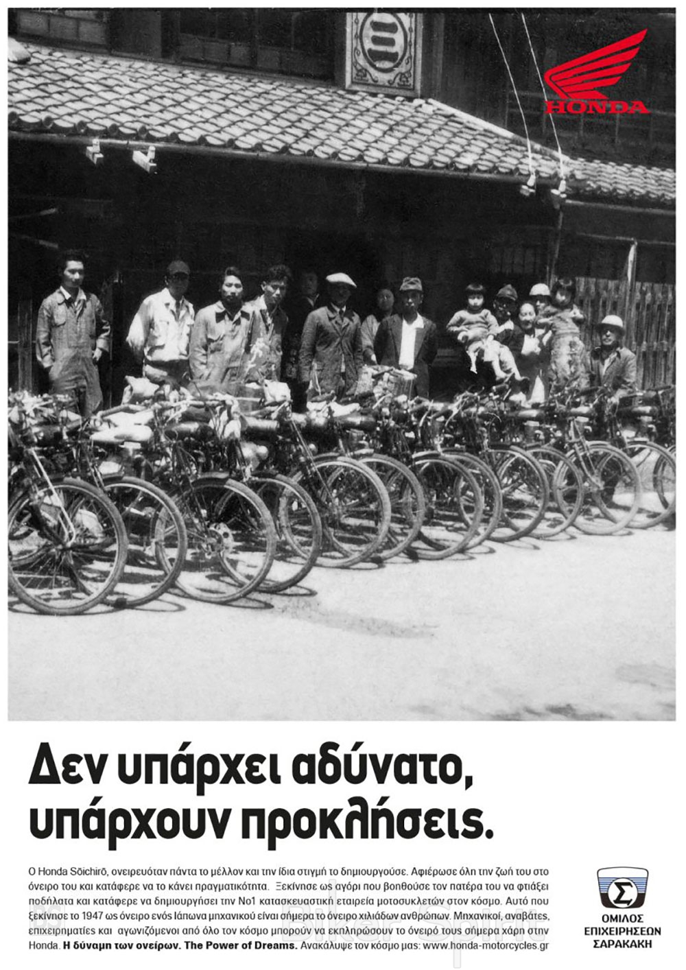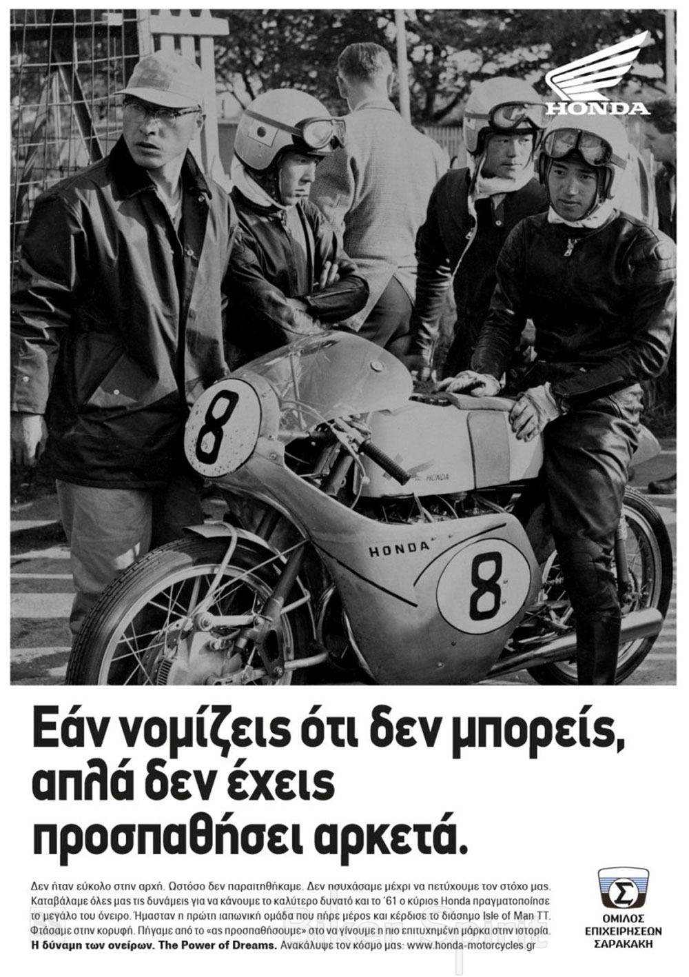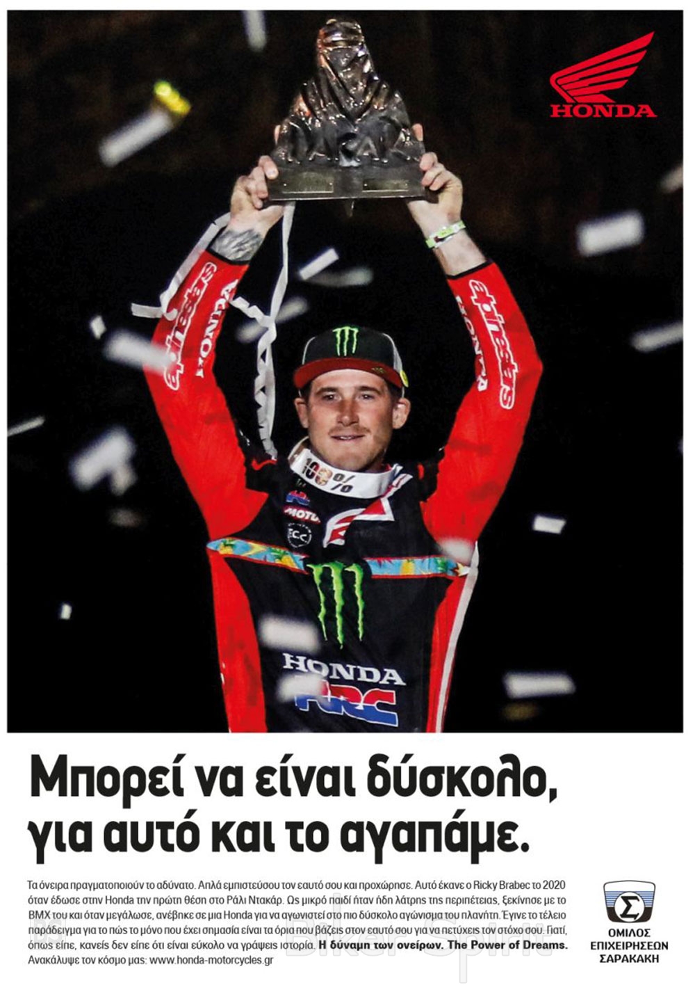 Ο Όμιλος Επιχειρήσεων Σαρακάκη και η Honda Moto για το 2022 παρουσιάζουν μία εντυπωσιακή, ιδιαίτερη και σίγουρα διαφορετική διαφημιστική καμπάνια η οποία εστιάζει στους διάσημους Πρεσβευτές – Αγωνιζομένους της Honda Moto παγκοσμίως, την πολύτιμη κληρονομιά της μάρκας καθώς και στην νοοτροπία και το πάθος του αναβάτη-οδηγού.