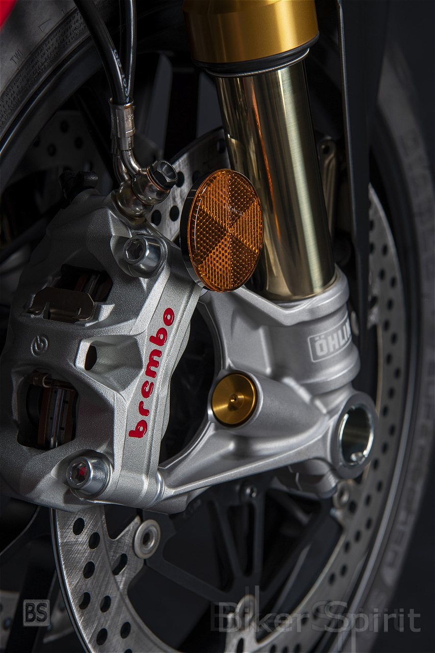 H νέα Panigale V4 S είναι εξοπλισμένη με το νέο ηλεκτρονικά ελεγχόμενο πιρούνι Öhlins NPX 25/30 που χρησιμοποιεί σύστημα απόσβεσης υπό πίεση που προέρχεται από αυτό των αγωνιστικών πιρουνιών της Öhlins, ελαχιστοποιώντας τον κίνδυνο σπηλαίωσης λαδιού σε σύγκριση με ένα παραδοσιακό μοντέλο. Το αποτέλεσμα είναι βελτιωμένη αίσθηση φρεναρίσματος και ταυτόχρονα καλύτερη απορρόφηση των κραδασμών, που μεταφράζεται σε συνολικά καλύτερη αίσθηση.