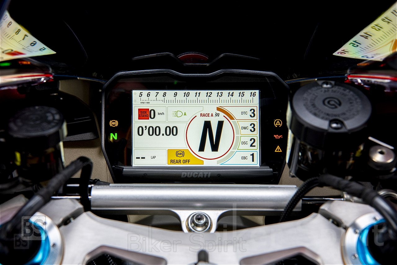 Αυτές οι παράμετροι μπορούν να επικοινωνηθούν στον αναβάτη ακόμη πιο αποτελεσματικά χάρη στο βελτιωμένο ταμπλό, το οποίο διαθέτει και μια νέα κατανομή των λειτουργιών των φώτων. Αλλά δεν είναι μόνο αυτό, οι τεχνικοί της Ducati εισάγουν μια πρόσθετη λειτουργία πληροφοριών, η οποία αναπτύχθηκε έχοντας υπόψη τις προτάσεις των αναβατών του MotoGP και ονομάστηκε “Track Evo”, μια επιλογή που προστέθηκε στις υπάρχουσες ρυθμίσεις δρόμου και πίστας.