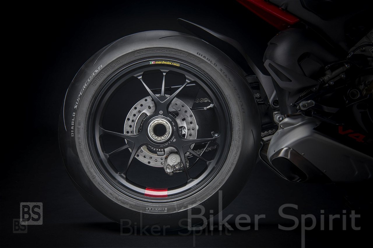 Η Panigale V4 S είναι εξοπλισμένη με ζάντες από σφυρήλατο κράμα αλουμινίου 3-ακτίνων και διαθέτει ελαστικά Pirelli Diablo™ Supercorsa SP (120/70 ZR17 εμπρός και 200/60 ZR 17 πίσω). Το σύστημα φρένων είναι εξοπλισμένο με μονομπλόκ δαγκάνες Brembo Stylema® μπροστά, με τέσσερα έμβολα διαμέτρου 30 χιλ. το καθένα σε δίσκους διαμέτρου 330 χιλ., εξασφαλίζοντας εξαιρετική ισχύ πέδησης, ενώ στο πίσω μέρος λειτουργεί ένας μονός δίσκος 245 χιλ. με δαγκάνα 2 εμβόλων.