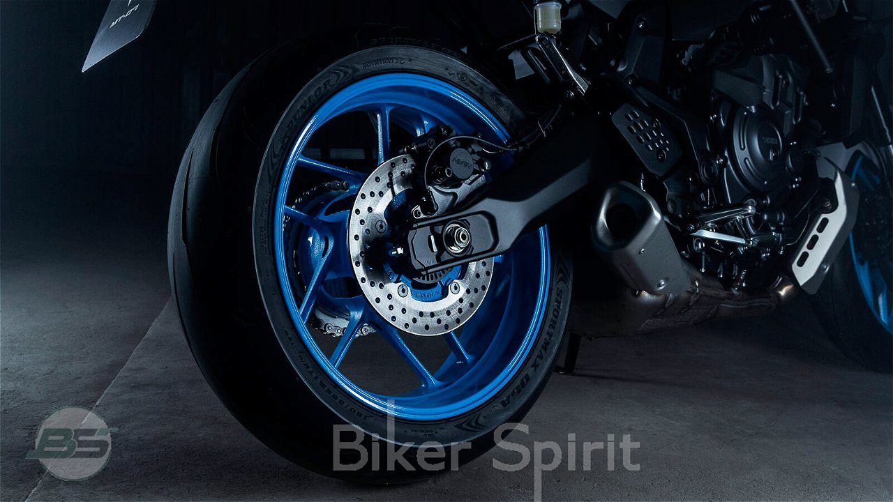Η MT-07 2025 χρησιμοποιεί μια ολοκαίνουργια σχεδίαση τροχών που έχει κατασκευαστεί με την κατοχυρωμένη τεχνική spinforging της Yamaha. Η διαδικασία έχει ως αποτέλεσμα τη δημιουργία μιας λεπτότερης και επομένως ελαφρύτερης ζάντας χωρίς συμβιβασμούς σε ότι αφορά την αντοχή. Ως αποτέλεσμα, η νέα MT-07 διαθέτει κατά 480 γραμμάρια ελαφρύτερους τροχούς από του προηγούμενου μοντέλου, οι οποίοι συμβάλουν σε μείωση της αδράνειας κατά 4%, τόσο μπροστά όσο και πίσω. Αυτοί οι ελαφριοί τροχοί όχι μόνο συνεισφέρουν στη συνολική μείωση της μάζας του οχήματος αλλά και στην αύξηση της ευελιξίας λόγω της μειωμένης αδράνειας, ειδικότερα στο μπροστινό μέρος.