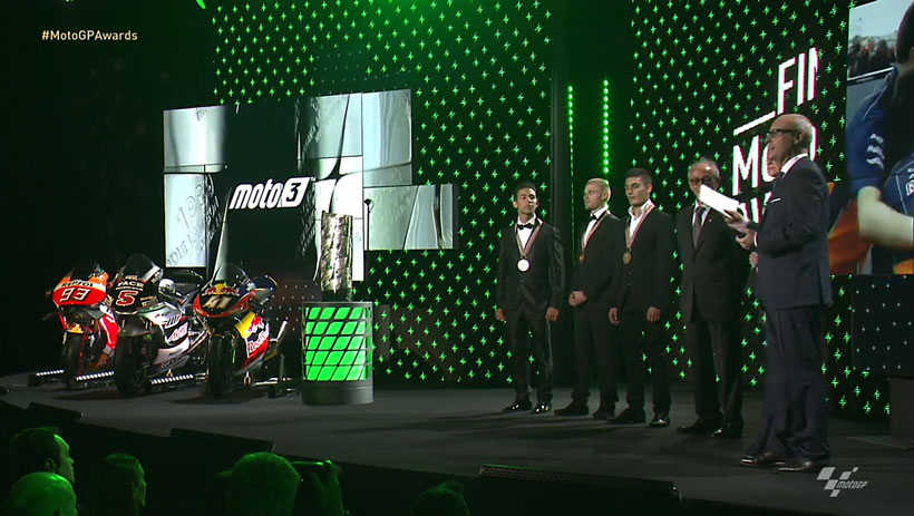 Στην βράβευση της κατηγορίας MotoGP βραβεύτηκαν με το χρυσό μετάλλιο ο Marc Marquez, με το ασημένιο μετάλλιο ο Valentino Rossi και με το χάλκινο μετάλλιο ο Jorge Lorenzo!. Ο Marquez σαν πρωταθλητής πρόσθεσε και την μεταλλική πλακά με το όνομα του, στο κύπελλο-τρόπαιο του MotoGP!