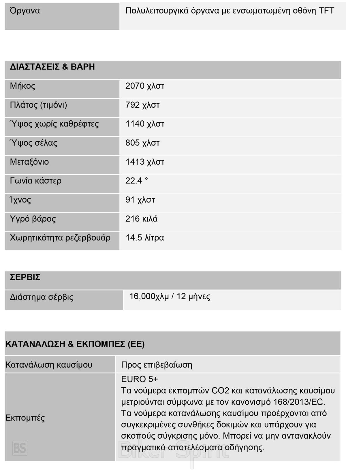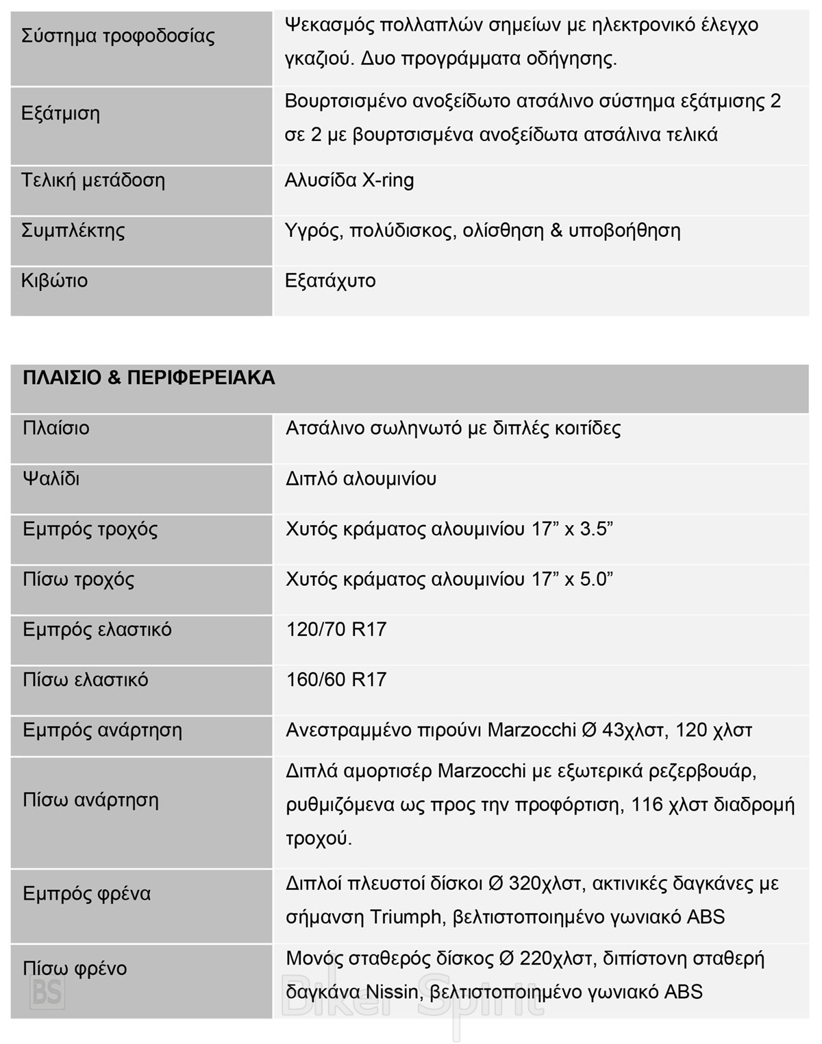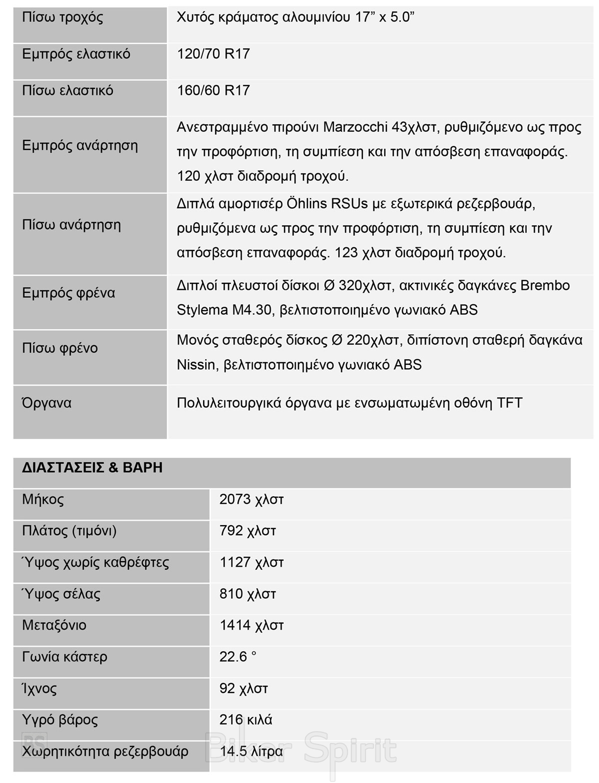 Το νέο μοντέλο RS θα προσφέρει ακόμα περισσότερα στους αναβάτες. Η πιο σπορ εργονομία, χάρη στο επανατοποθετημένο τιμόνι και τα τραβηγμένα προς τα πίσω μαρσπιέ, συνδυάζονται με ένα εξαιρετικό επίπεδο προδιαγραφών, συμπεριλαμβανομένου του πλήρως ρυθμιζόμενου πιρουνιού Marzocchi, των πίσω αμορτισέρ κορυφαίων προδιαγραφών Öhlins, καθώς και των δαγκάνων Brembo Stylema.